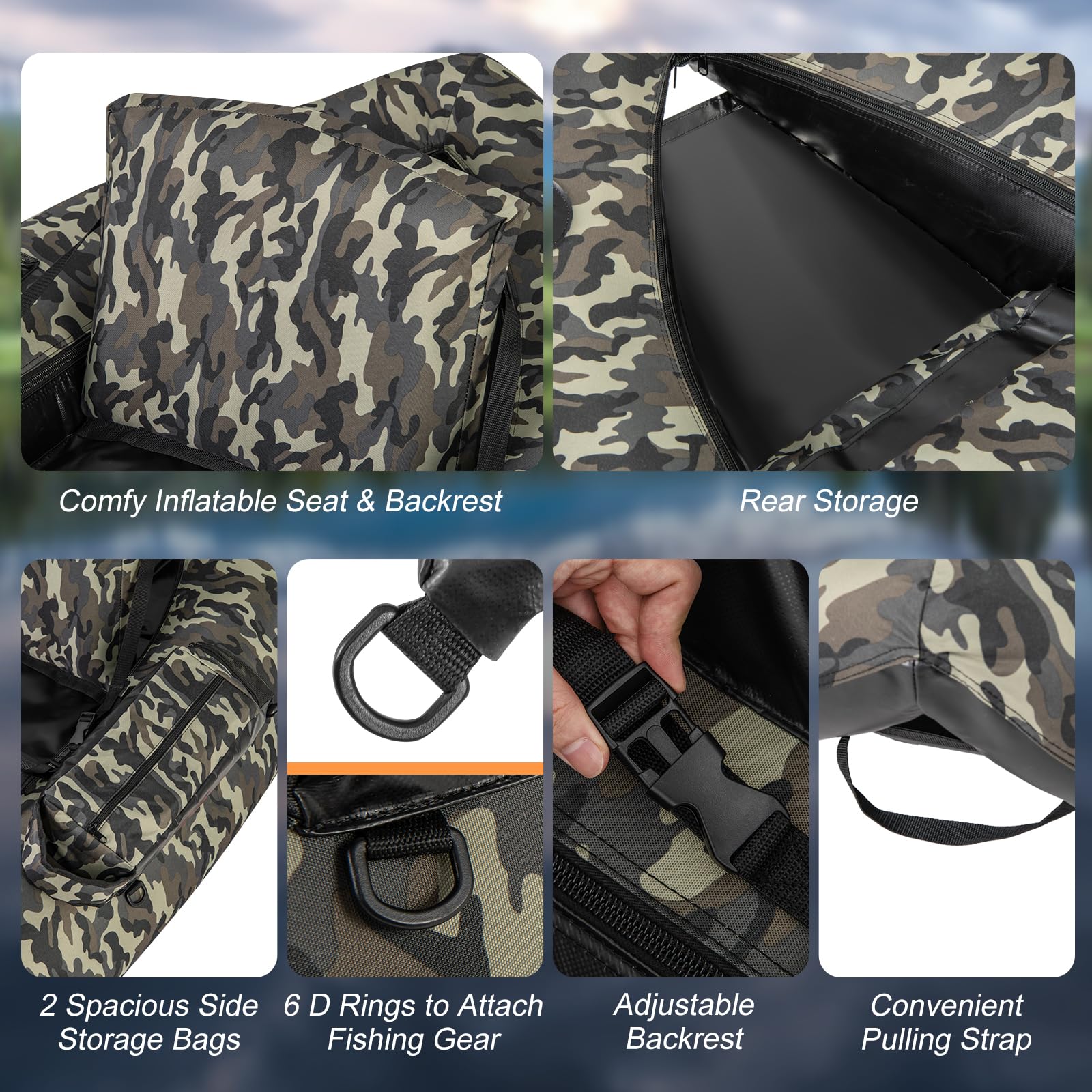- Multiple Storage: The fishing boat features two spacious side storage bags for storing your tackle box, bait, snacks, and other essentials within easy reach. It also includes a rear storage compartment for keeping caught fish. With six strategically placed D rings, you can securely fasten your gear while focusing on fishing.