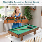 Featuring foosball, billiard, table tennis, and hockey games, this game table provides various fun for all ages. The stackable tabletop design allows for easy transitions between games, saving space and time. With manual scoreboards, kick-off holes, smooth metal rods, and anti-slip handles, you will experience smooth gameplay and precise control. This compact table is versatile for tabletop or floor play, making it perfect for various settings. Complete with all accessories needed for each game, this multi game table set is ideal for home, game room, office, dorm, parties, and more.
