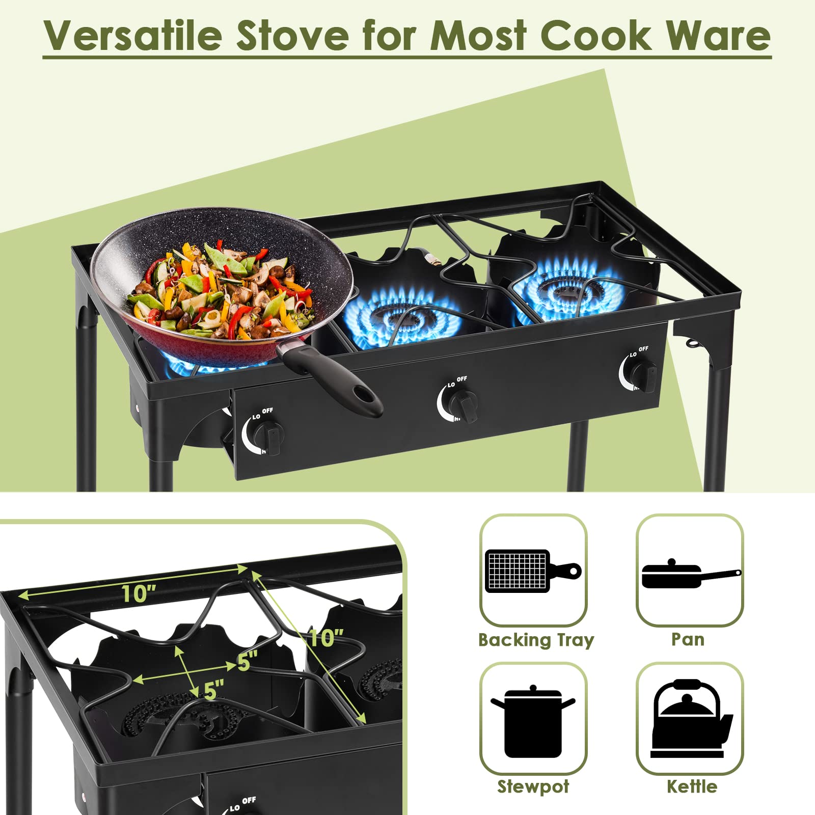 - High Heat Output with Triple Burners: Featuring three powerful 225,000-BTU burners (75,000 BTU each), this propane camping stove allows for faster cooking. The 3 burners can also be used individually, making it convenient to prepare ketchup canning, fry fish, chicken, sausages, bacon, eggs, and boil soup.This propane stove accommodates to standard 20LB propane tank (not included).
