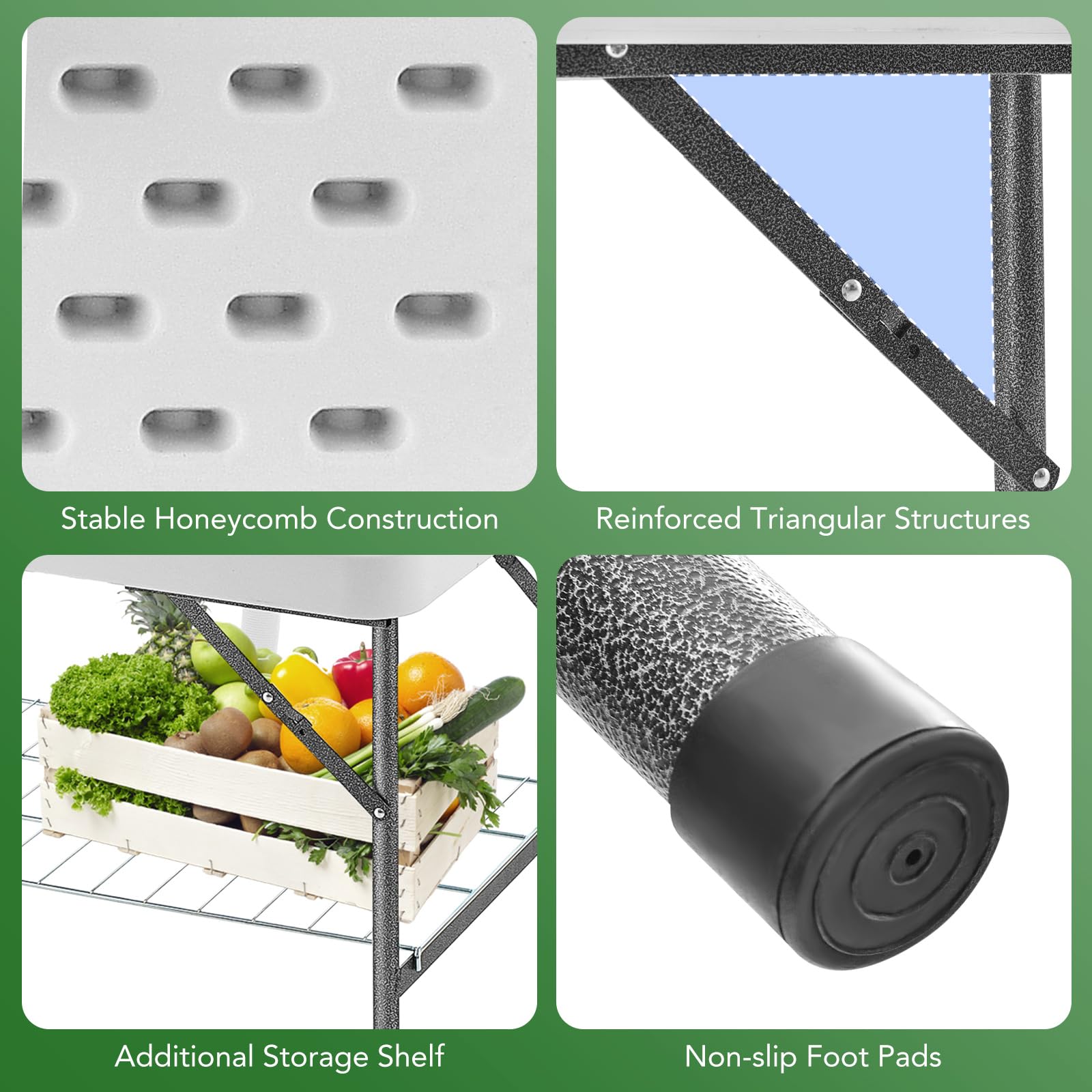 - Heavy-duty Construction: Crafted with high-strength HDPE material, the tabletop stands the test of time. Moreover, the sturdy metal frame with reinforced triangular structures contributes to overall stability, allowing the tabletop to support up to 330 lbs. And the non-slip foot pads keep this portable fillet station more stable.