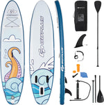 - 【High Quality and Sturdy Construction】The paddle board adopts the high quality EVA and drop-stitch construction, which allow the surfboard withstand a lot of pressure without deforming or bursting. And the EVA has good friction, which will prevent you from sliding. It's sturdy and safe for long time use.