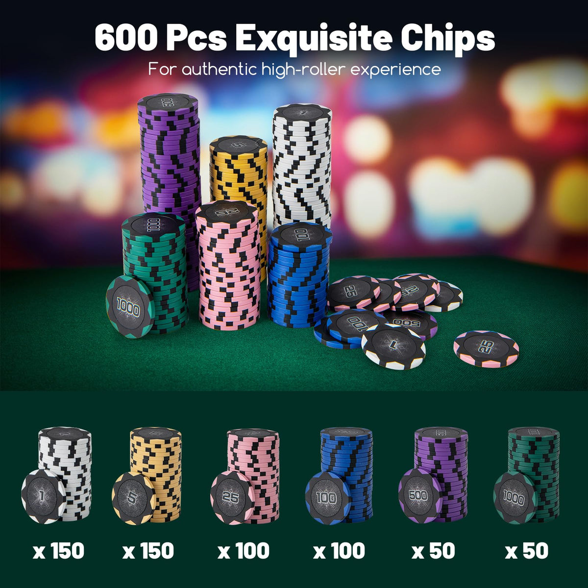 600 exquisite chips in 6 vibrant colors for authentic high-roller experience