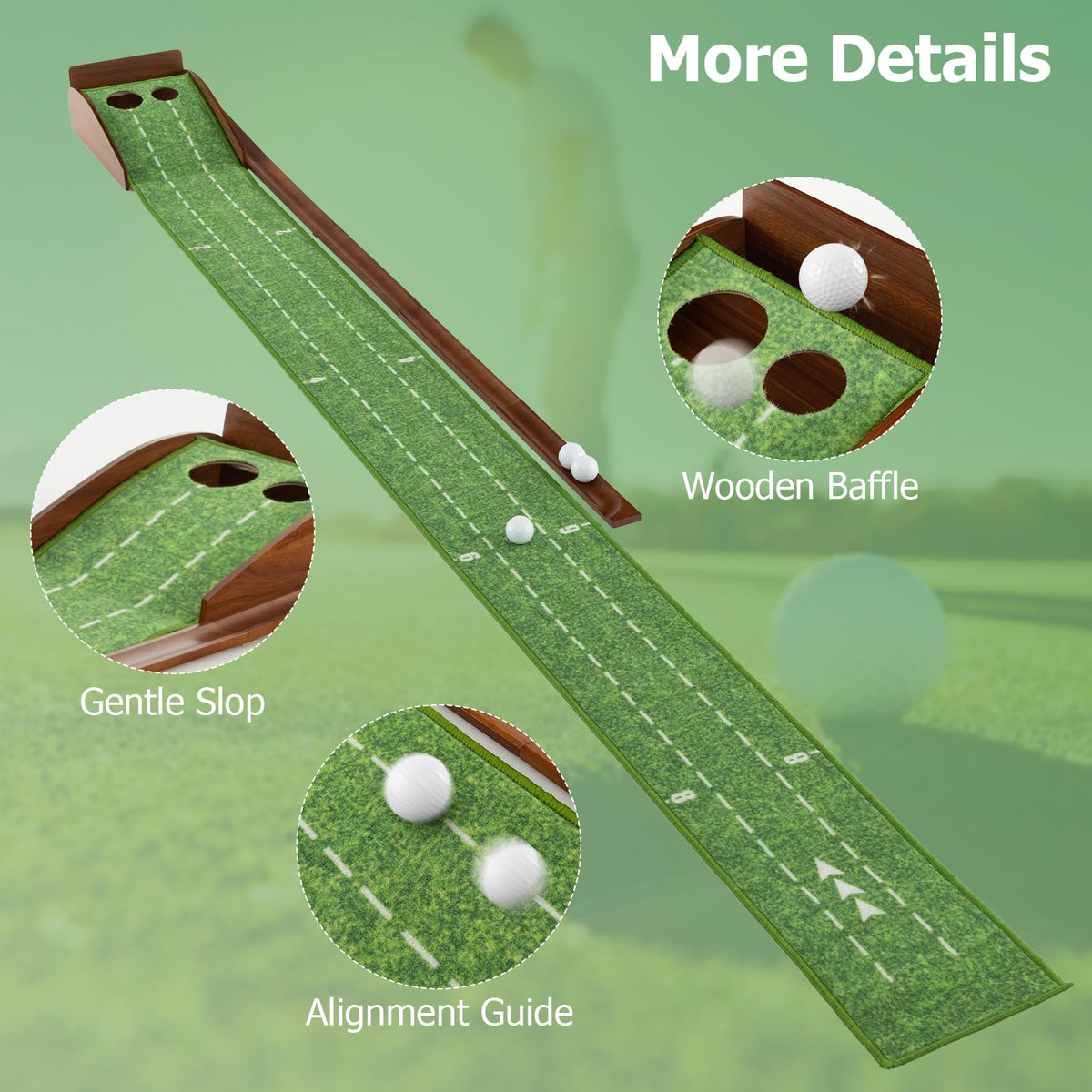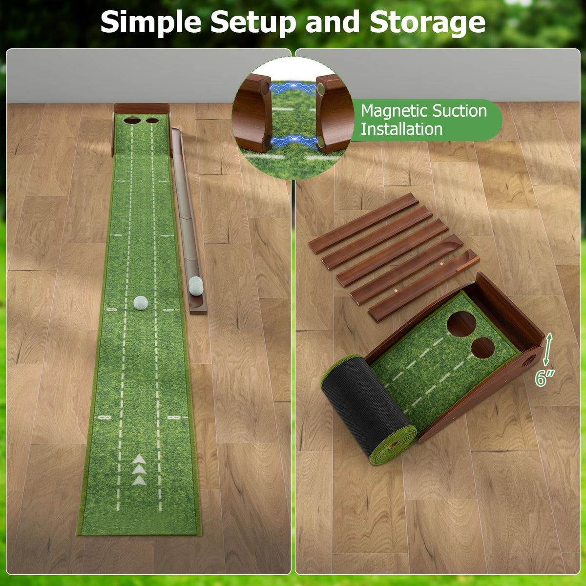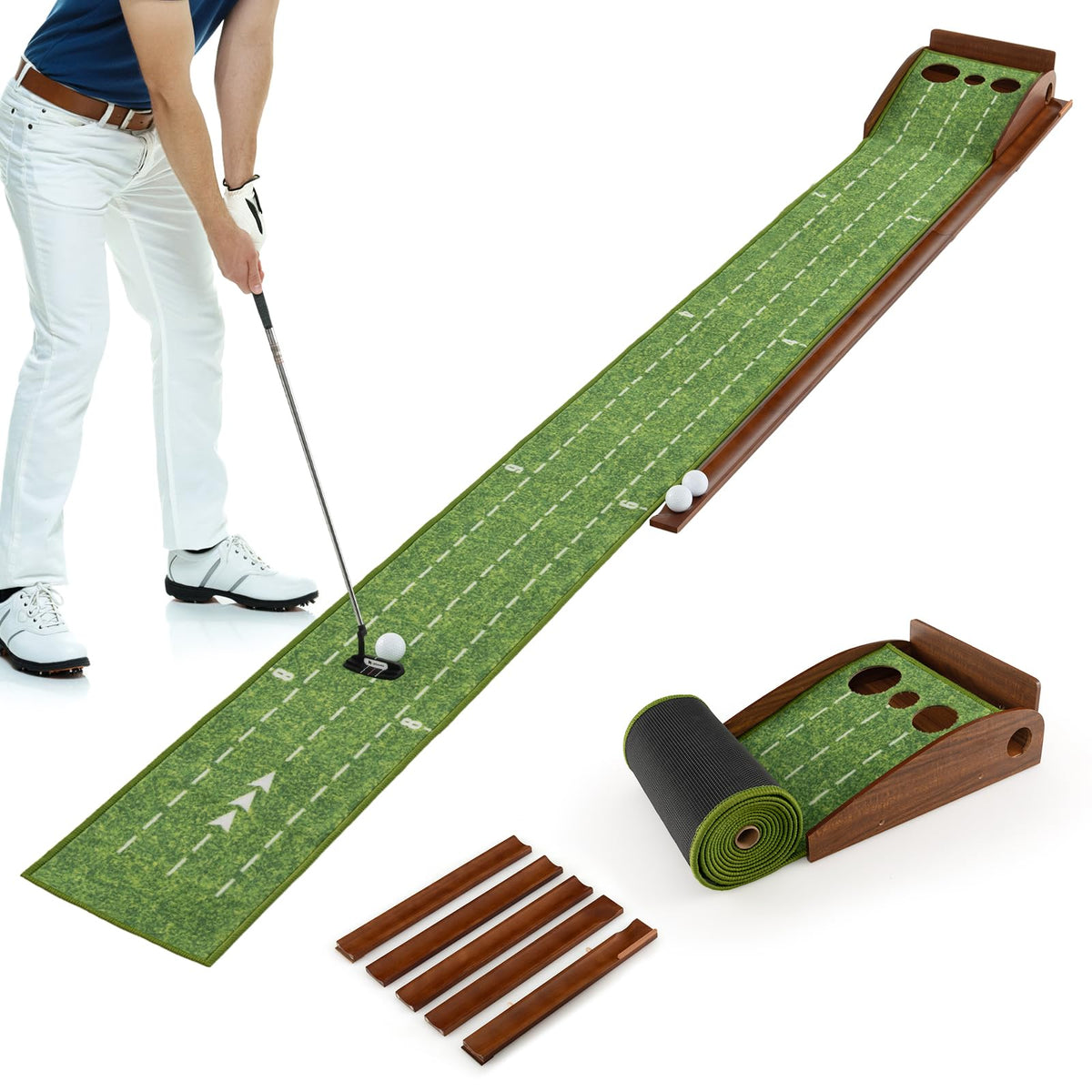 Featuring an innovative auto-ball return, this golf putting green is designed for seamless practice sessions. Step into the world of precision with 2/3 hole training options and improve your stroke with expertly placed alignment guides at 2, 4, 6, and 8 feet. Sharpen your distance control, enhance your aim and enjoy a true-roll surface that mimics the feel of the green for the ultimate putting experience. Designed for simple setup and storage, this durable golf game practice equipment offers a premium practice playground for both amateurs and pros alike.