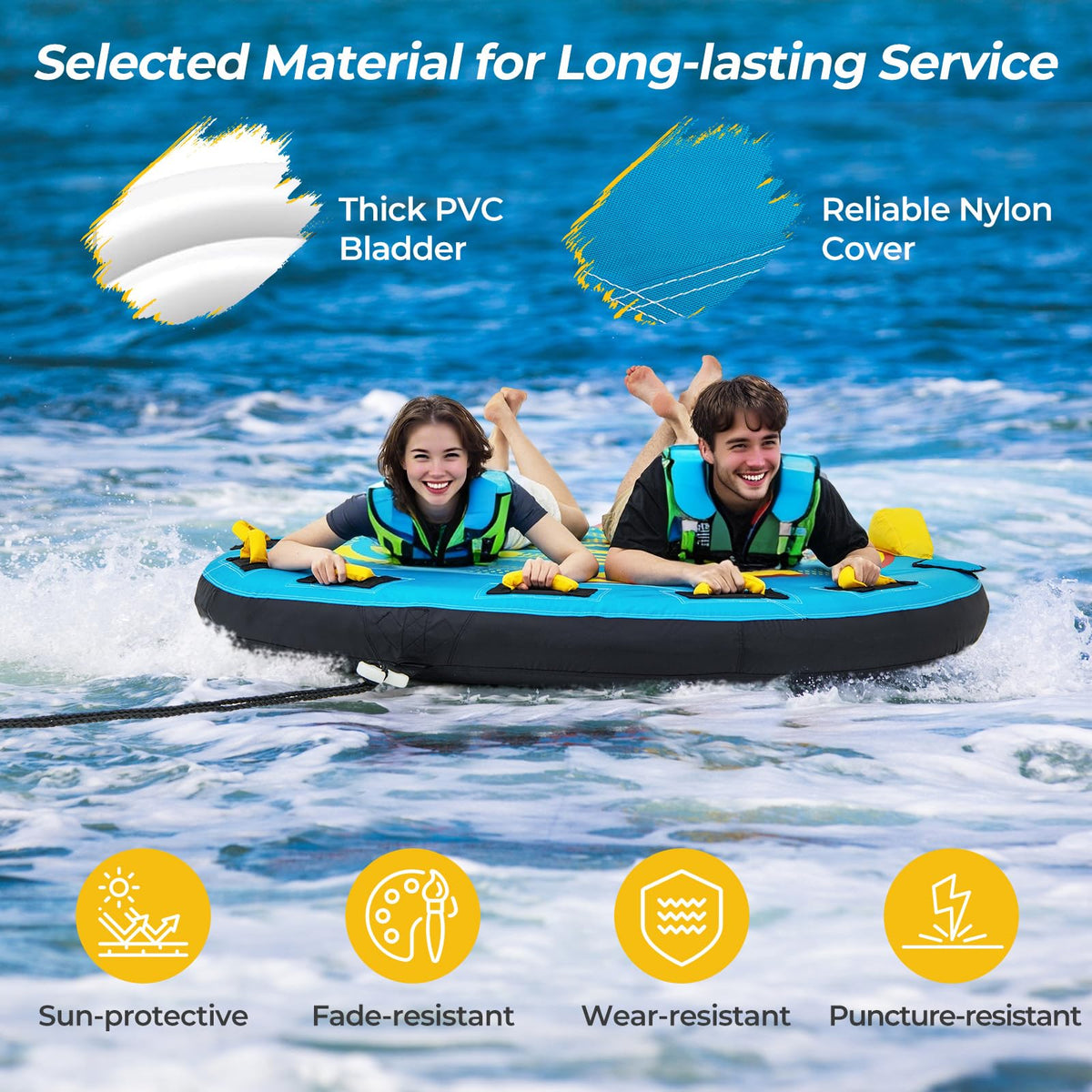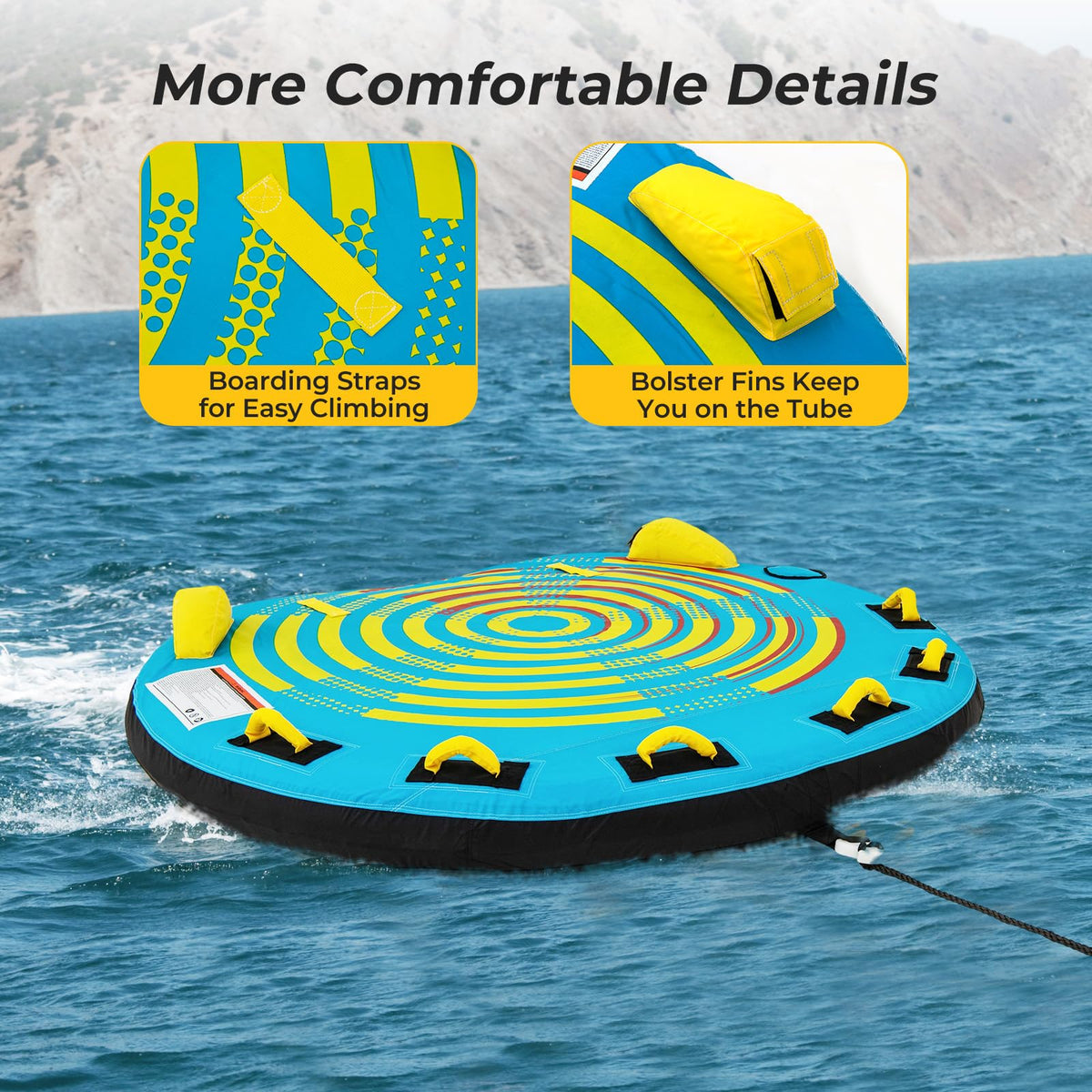 Crafted with a thickened PVC bladder and sturdy nylon cover, GYMAX towable tubes offer sun-protection, fade-resistance and wear-resistance. The u-shaped streamline design ensures smooth ride whether you're lying face up or on your stomach. The sturdy tow point system connects easily to tow rope, while foam-padded handles and side fins ensure comfortable and safe rides. The bottom drainage system efficiently removes water. This tube handles speeds up to 20 mph, providing versatile fun for all your water activities, ideal for oceans, lakes, rivers, or pools.