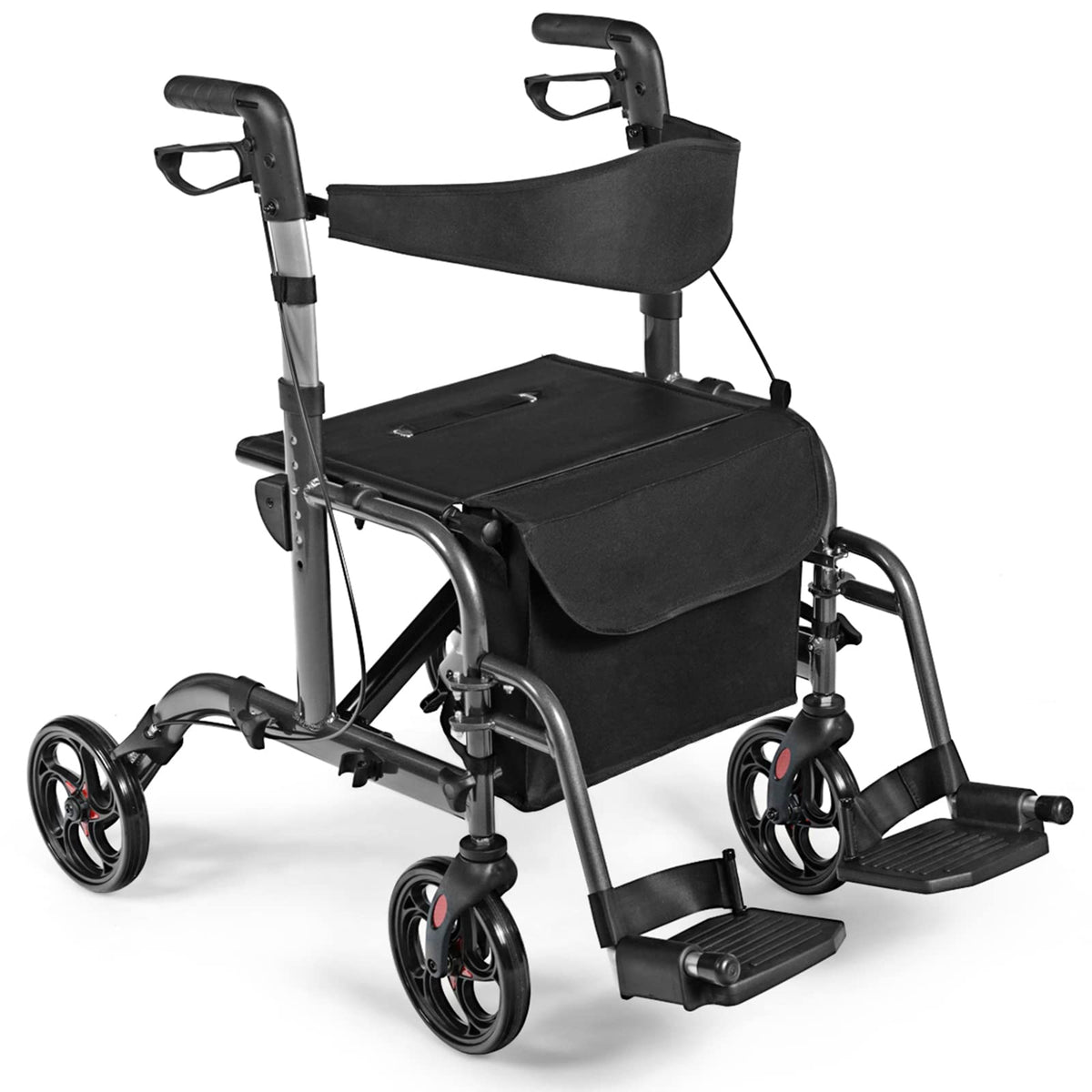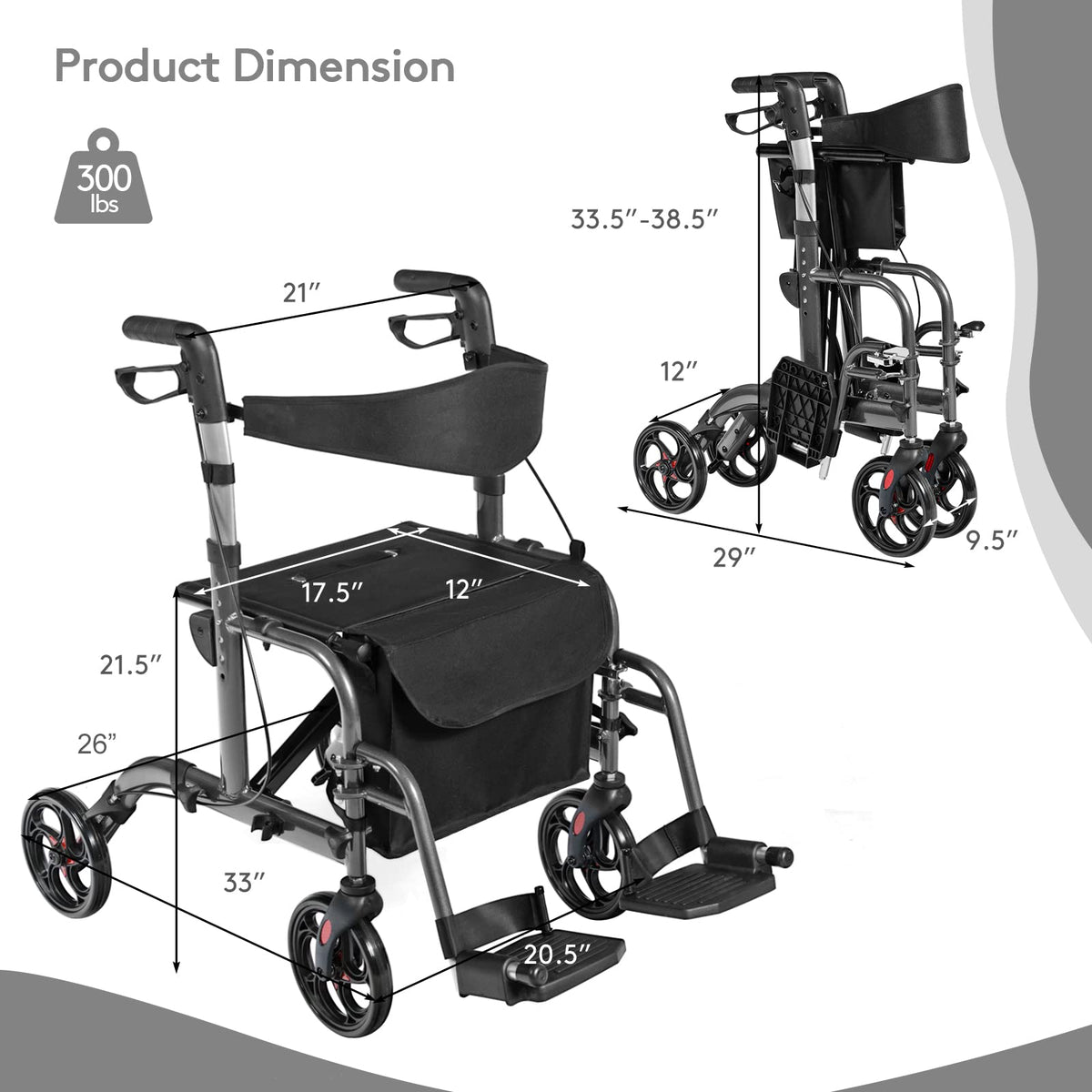 GYMAX 2 in 1 Foldable Rollator Walker, Height Adjustable 4 Wheel Transport Chair with Reversible Backrest
