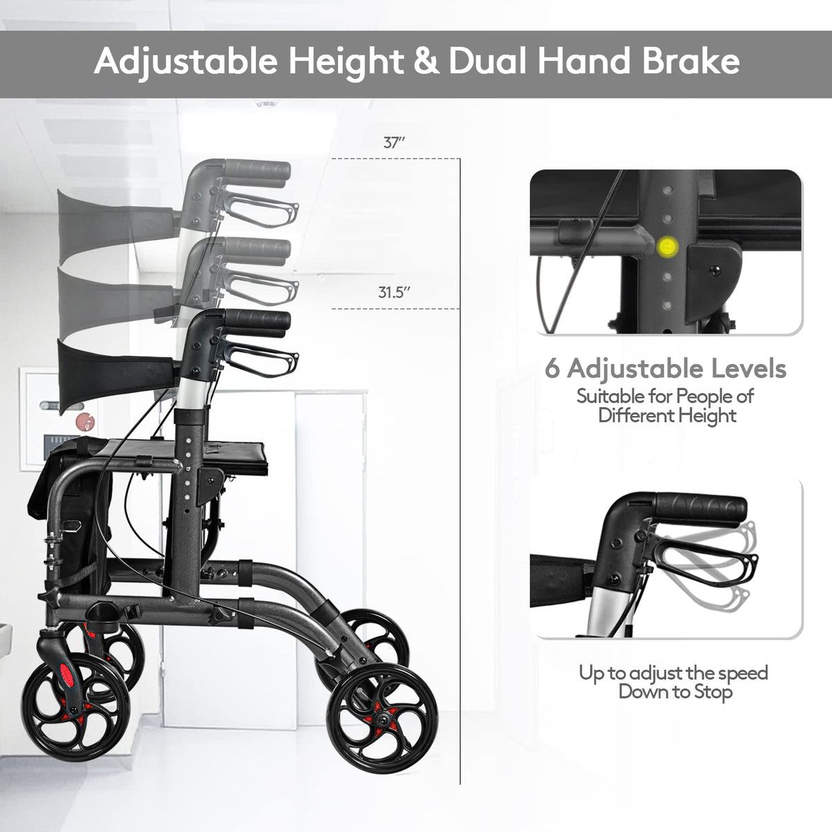 - 6-Level Adjustable Heights: The height of this rollator walker can be adjusted from 33.5” to 38.5” with 6 level, which fits people of different heights. Moreover, the handbrake has two functions, lifting up to lower the speed or pulling down to stop the walker immediately.