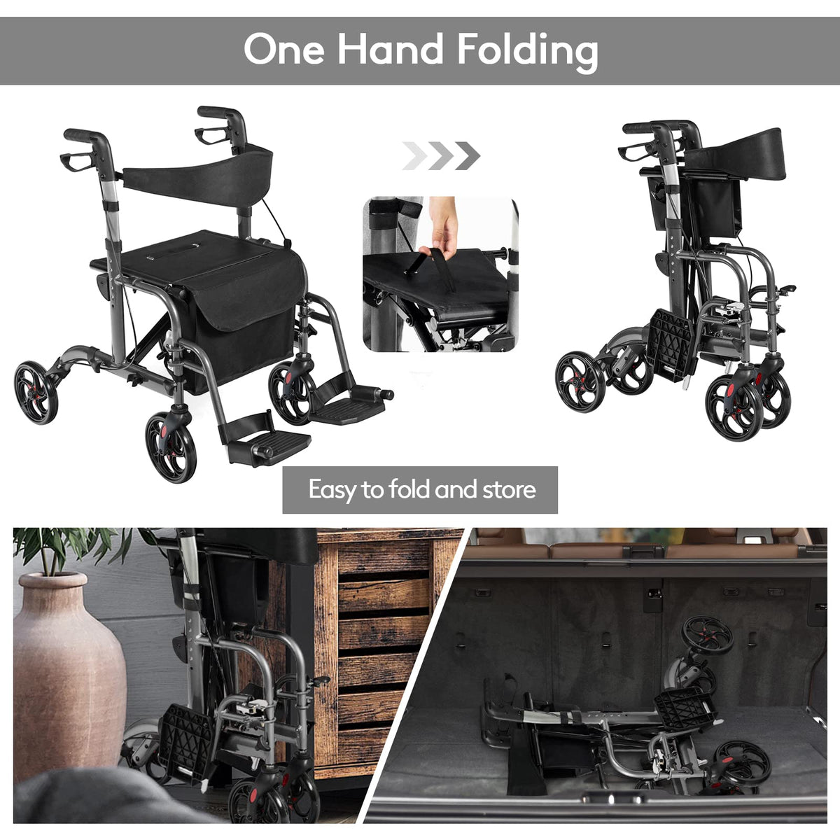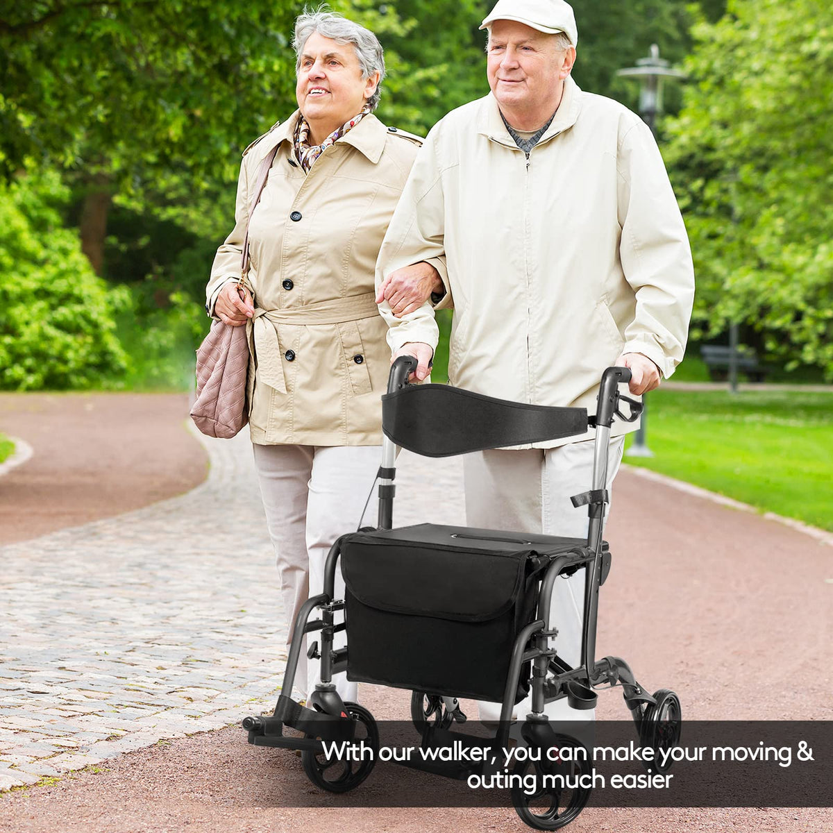 - 2 in 1 Rollator Walker: This multipurpose walker not only assists walking, but works as a premium wheelchair, offering a stable and safe seat when needed. Simply reversing the backrest and changing its direction, you can switch the rollator between auxiliary walker or wheelchair.