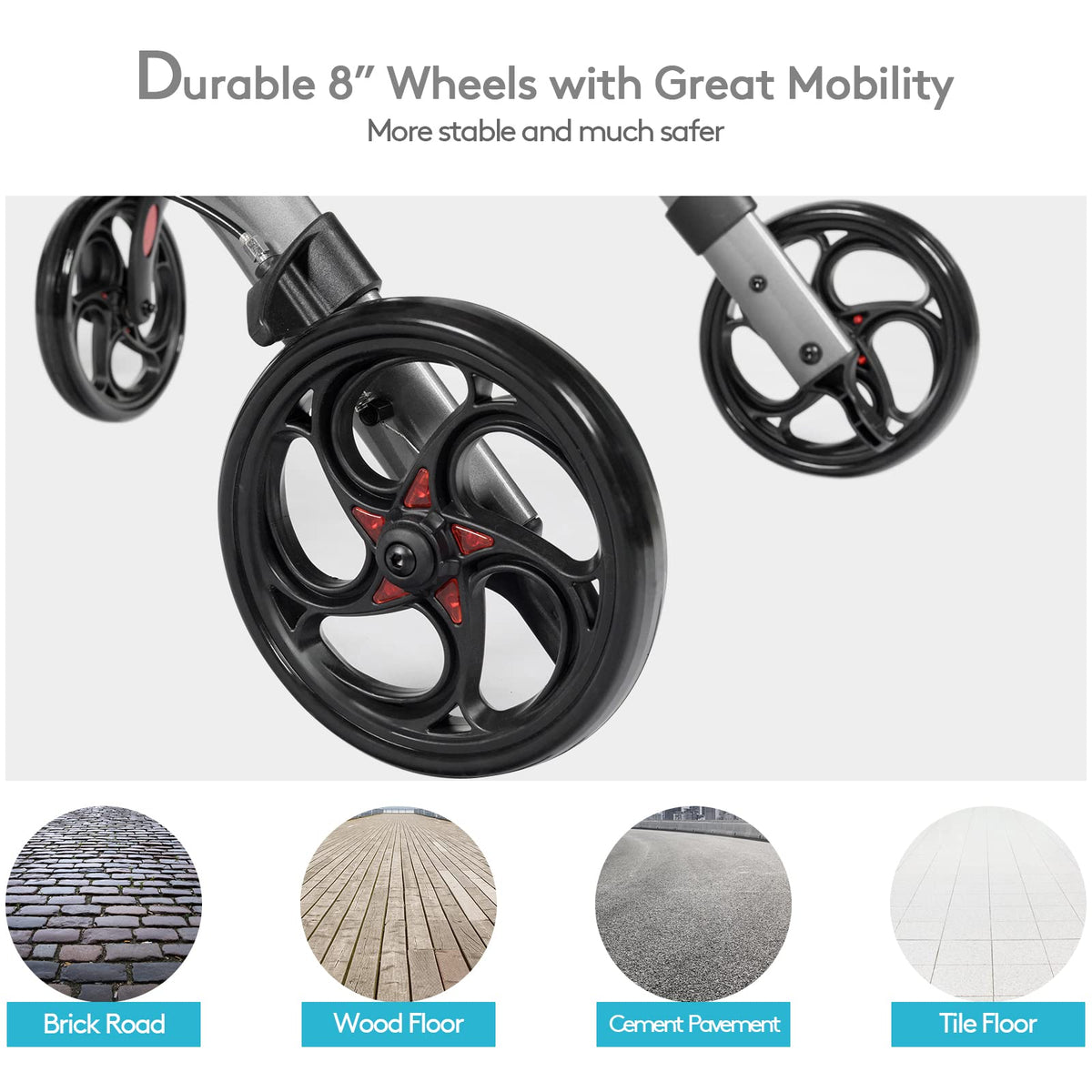 - High Quality Construction: This rollator walker is made of sturdy aluminum frame, which features strong support up to 300lbs. The durable 8” wheels ensures the walker roll on versatile grounds smoothly and stably.