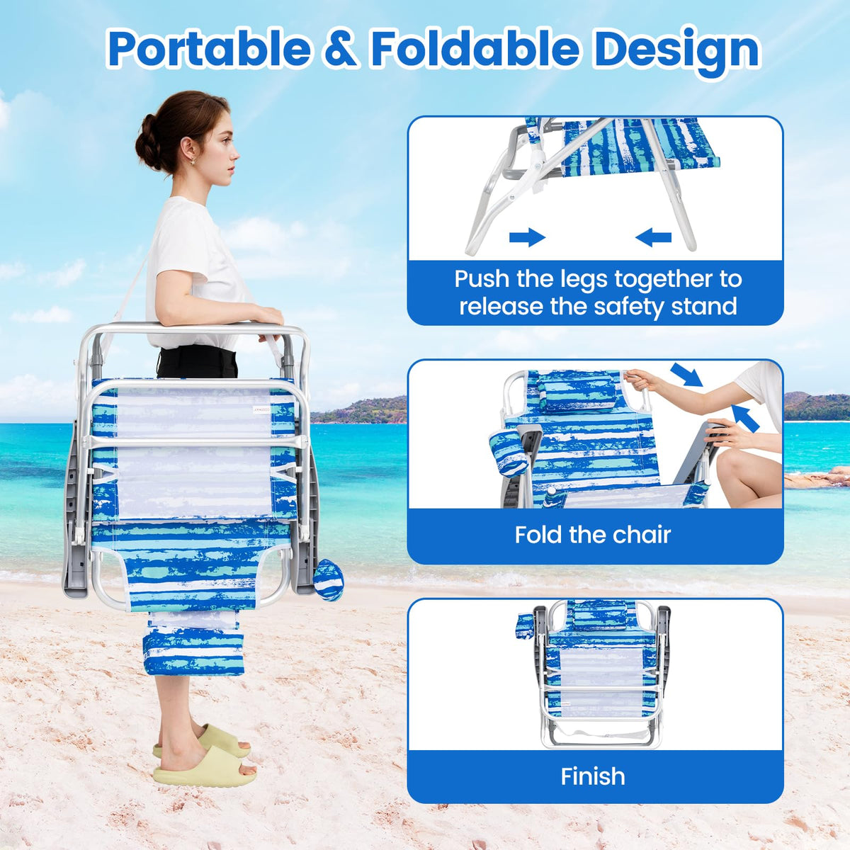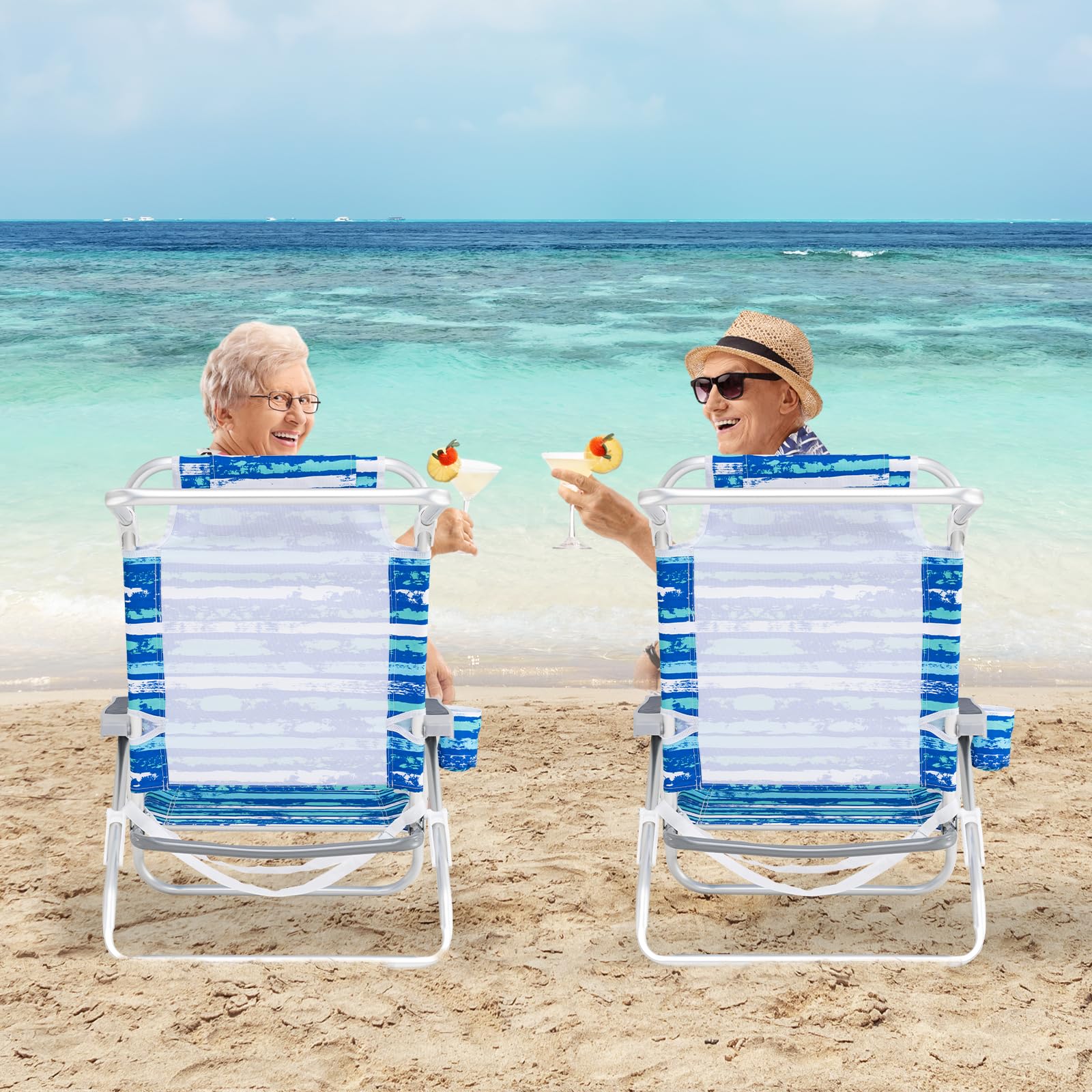 Ergonomic beach chair with armrests and high backrest for extended sitting comfort