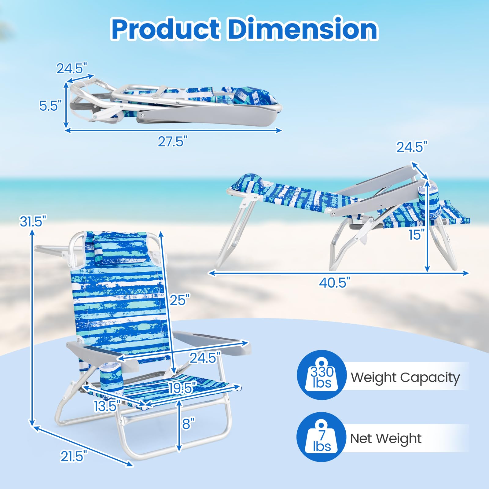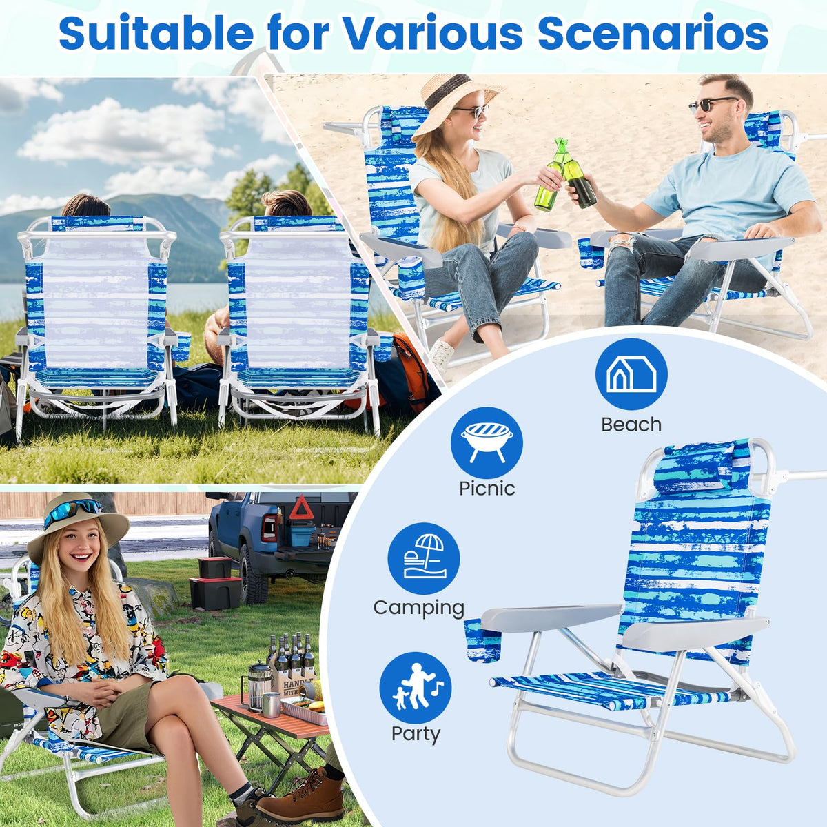 Experience ultimate relaxation with our ergonomic beach chair, designed for all-day comfort. The armrests and 5-position adjustable backrest with a natural reclining angle provide exceptional support. Wrapped in reliable, PU-coated 600D Oxford fabric, this chair resists wear and tear while offering a quick-drying, easy-to-clean surface. The sturdy aluminum frame is sturdy and durable, and the reinforced bar improves overall stability. Weighing just 7 lbs with a carrying strap, the folding lounge chair is effortless for transport and storage. This versatile chair is perfect for beach trips, poolside lounging, patio relaxation, or garden gatherings.
