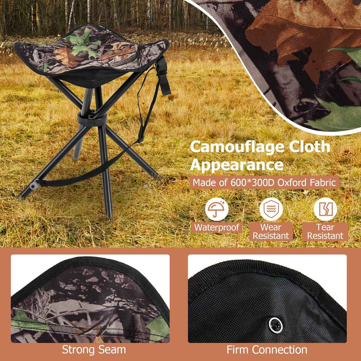 - Camouflage Cloth Appearance: The portable camouflage hunting stool uses 600*300D Oxford fabric that is waterproof, wear resistant and tear resistant. The strong seam and firm connection bring reliable durability.