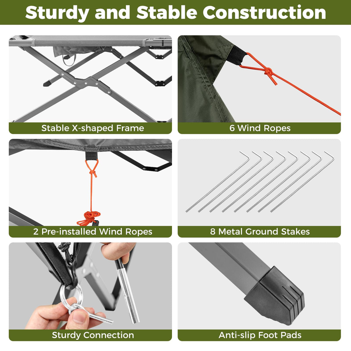 This versatile camping set features a 2-person cot and a tent with a detachable rainfly (PU 3000mm waterproof rating; not for heavy rain or strong wind). The elevated cot keeps you dry, while the tent ensures comfort with excellent ventilation via 2 mesh doors and a skylight, offering views while keeping insects out. Highly portable with an included wheeled carry bag, it's perfect for various outdoor adventures. Added convenience comes from a lantern hook, storage pockets, and under-cot shoe storage, making it both comfortable and practical.