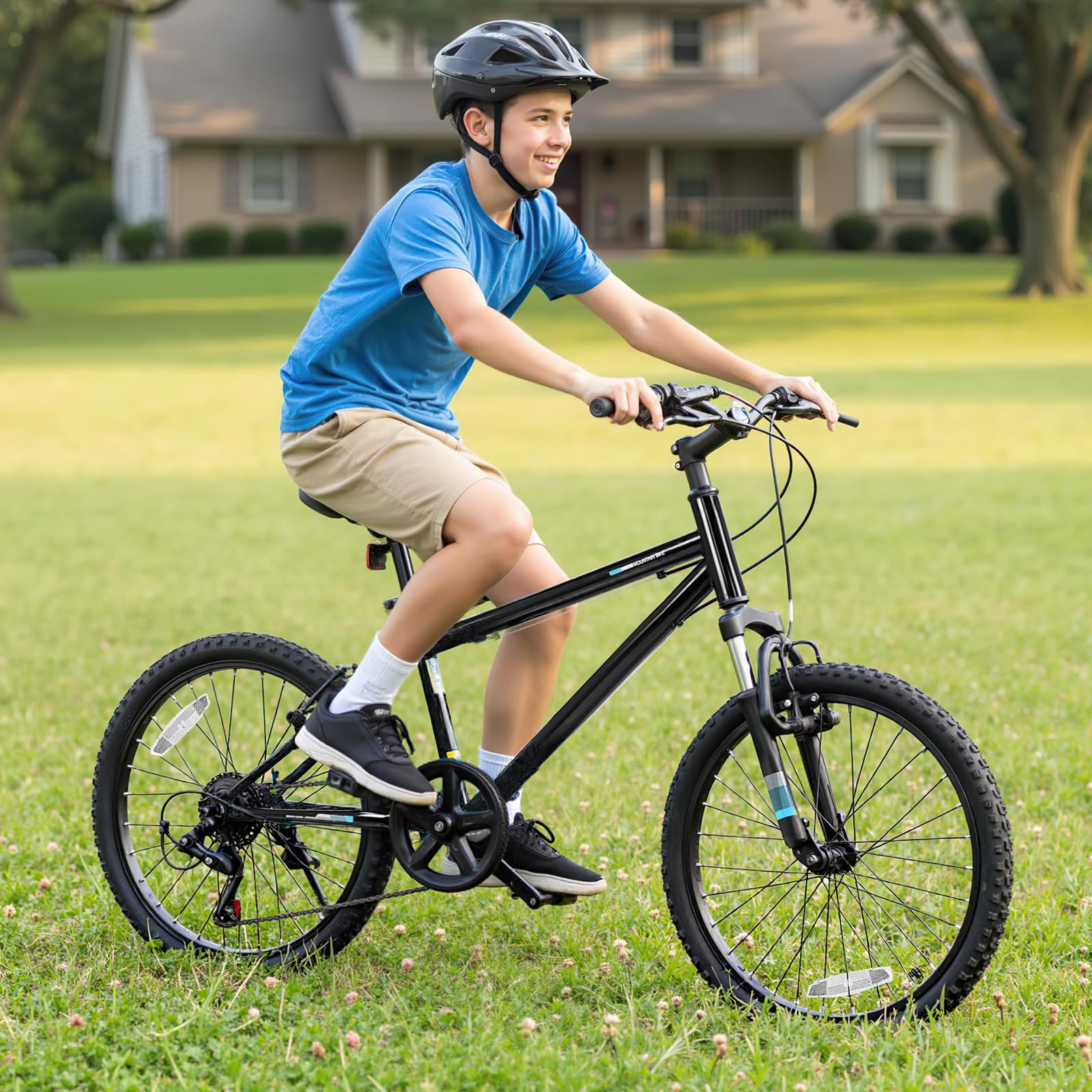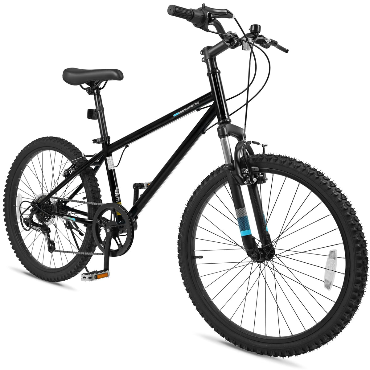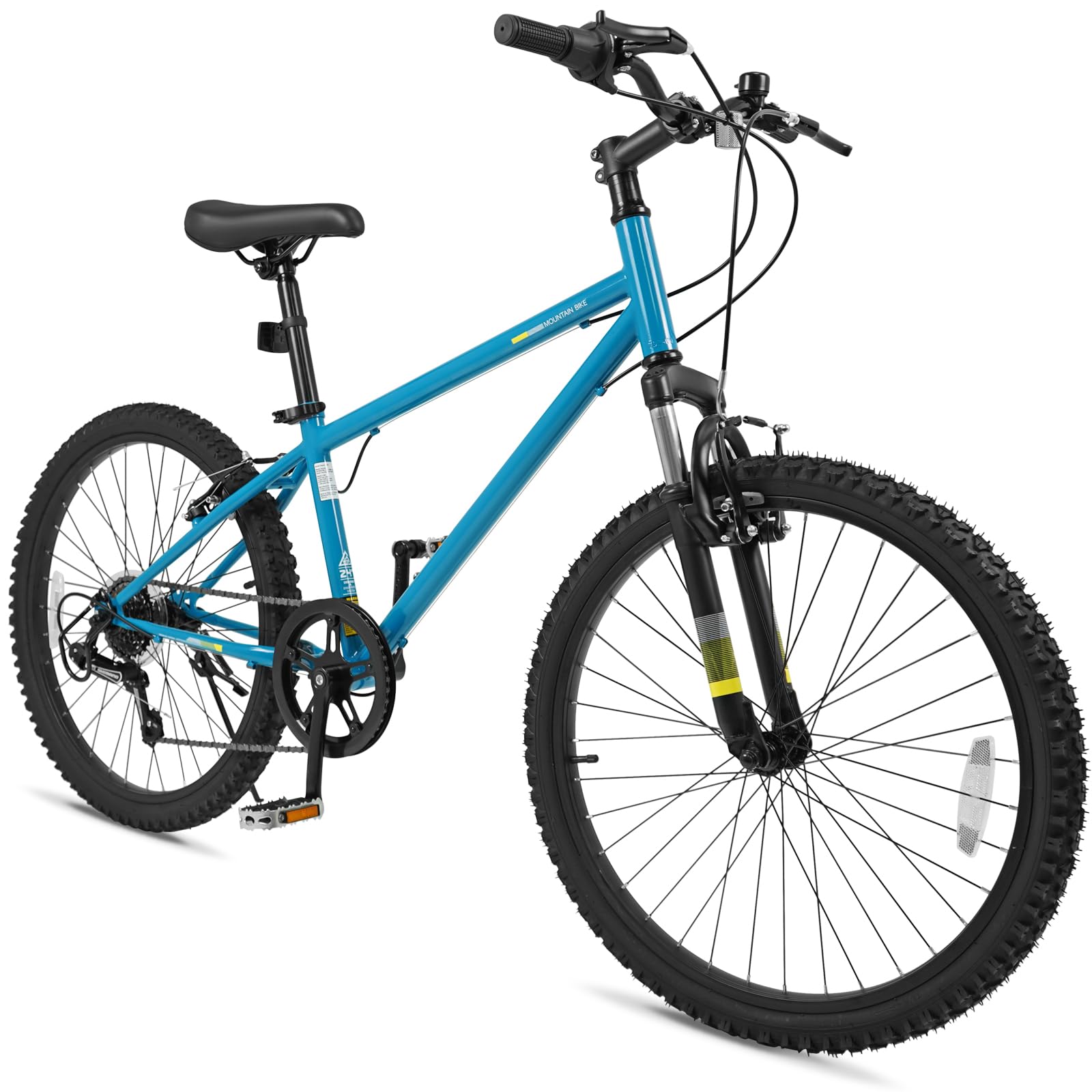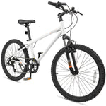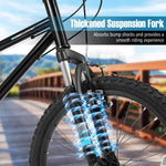This kids' mountain bike is designed with a thickened front suspension fork that effectively absorbs bump shocks, ensuring a smooth and comfortable ride. The large premium tires are anti-puncture and wear-resistant, making them suitable for a variety of road surfaces, including city roads, snow roads, mountain roads, and muddy roads. Additionally, the 6-speed drivetrain offers a suitable gearing range for both climbs and descents, with a twist shift mechanism that allows for simple and quick gear changes. For safety, the bike is fitted with reliable front and rear V-brakes, providing secure and sensitive stopping power. Plus, the solid metal frame and adjustable padded saddle enhance comfort and stability.