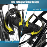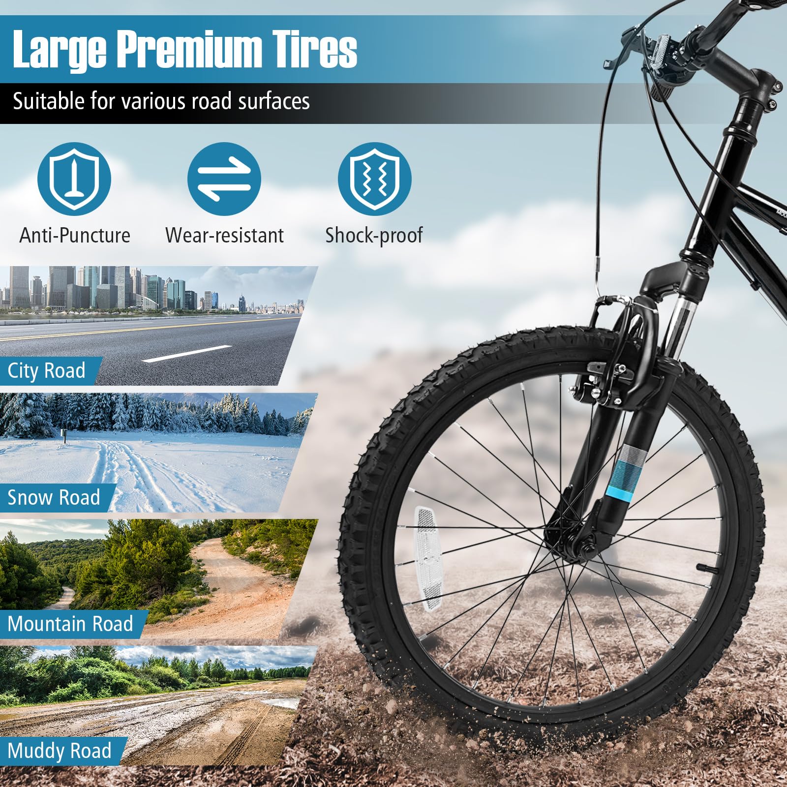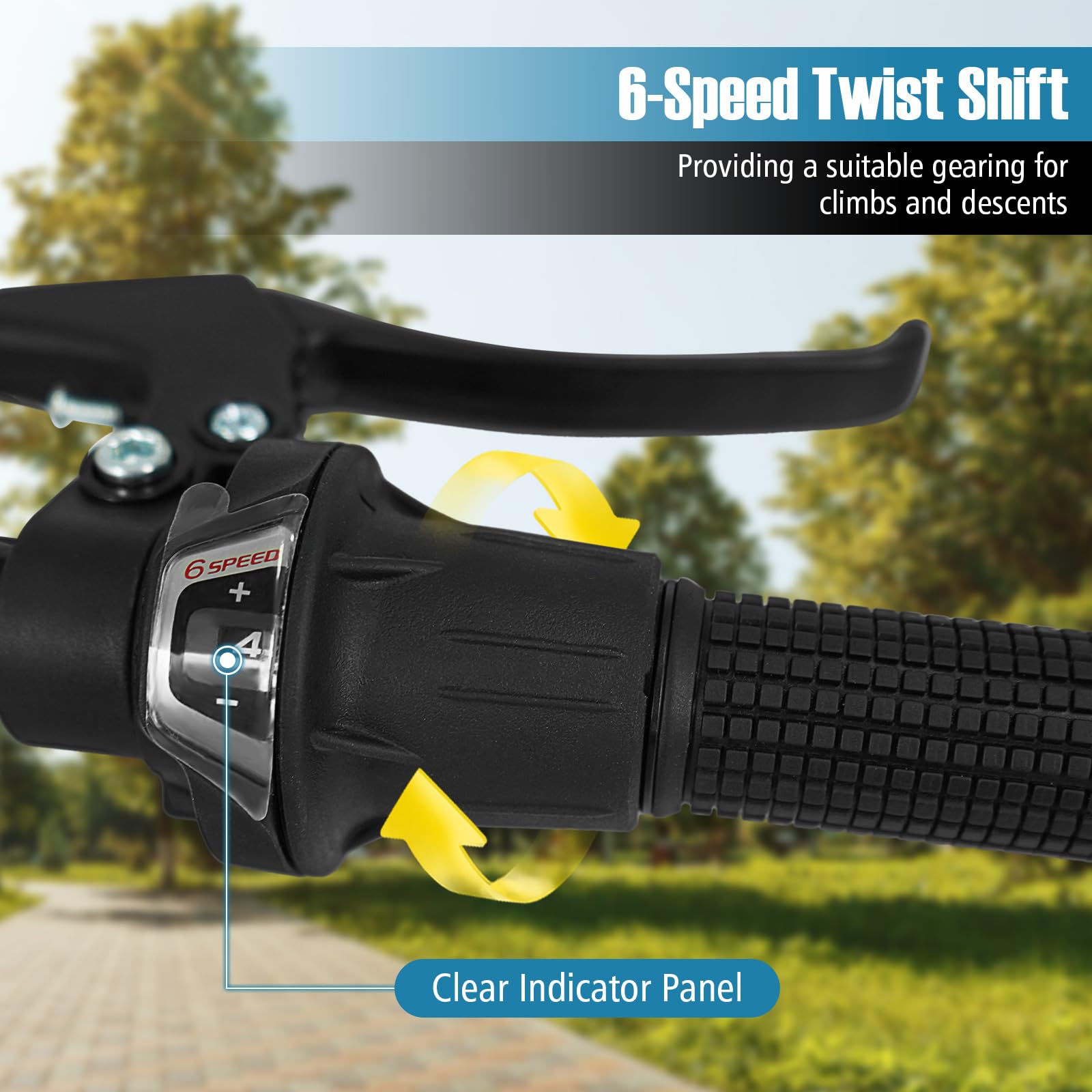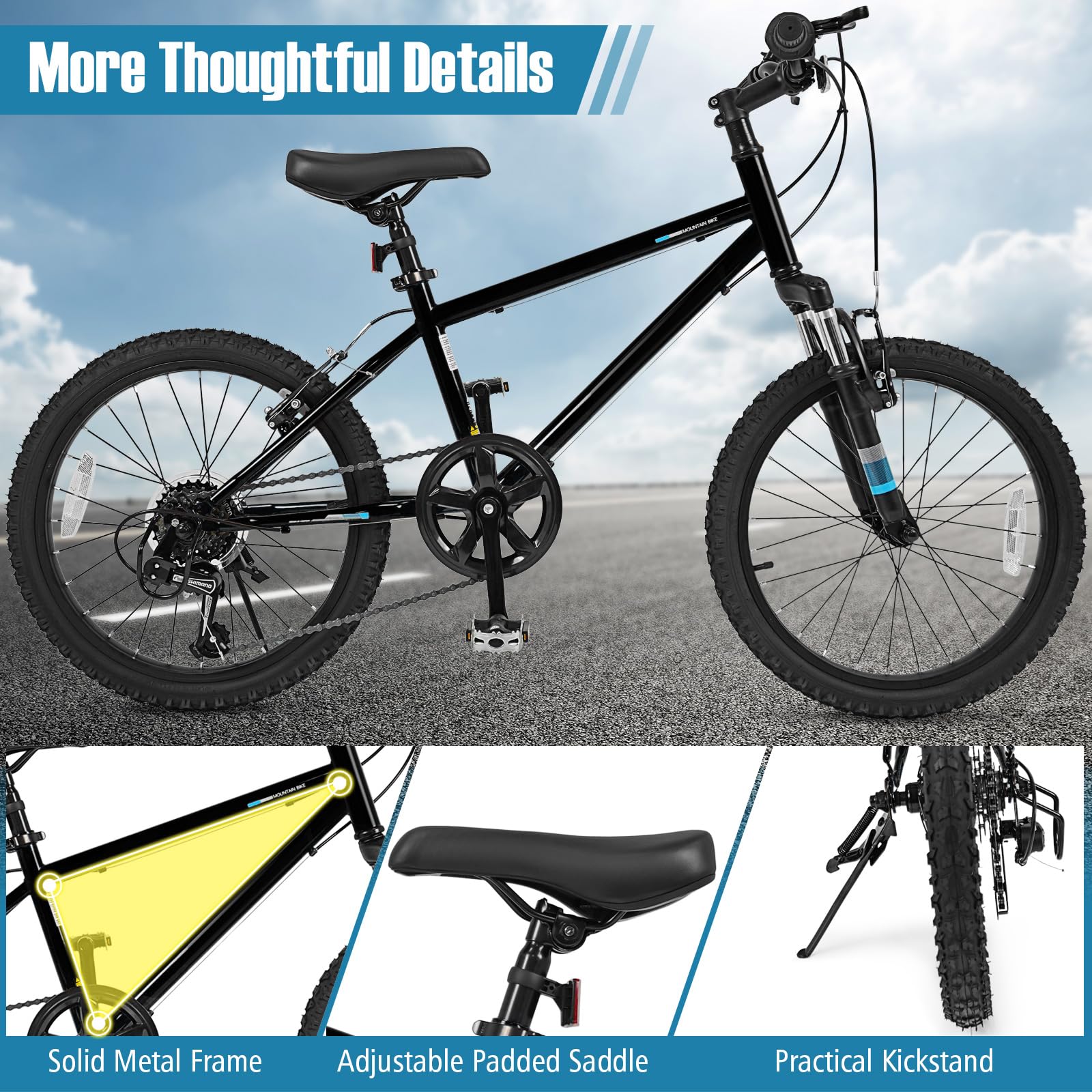 This kids' mountain bike is designed with a thickened front suspension fork that effectively absorbs bump shocks, ensuring a smooth and comfortable ride. The large premium tires are anti-puncture and wear-resistant, making them suitable for a variety of road surfaces, including city roads, snow roads, mountain roads, and muddy roads. Additionally, the 6-speed drivetrain offers a suitable gearing range for both climbs and descents, with a twist shift mechanism that allows for simple and quick gear changes. For safety, the bike is fitted with reliable front and rear V-brakes, providing secure and sensitive stopping power. Plus, the solid metal frame and adjustable padded saddle enhance comfort and stability.