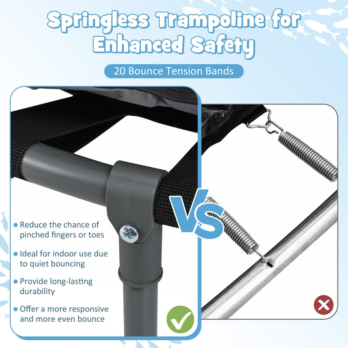 The colorful LED lights on the jumping mat offer 3 lighting modes. Features no-spring design, this mini trampoline for kids uses bounce tension bands for a safer and more uniform bounce. The powder-coated frame and non-slip foot pads ensure stability and durability. Easy to assemble and foldable for storage, this ASTM and CPSIA compliant trampoline is ideal for indoor or outdoor use, offering a secure and entertaining playtime option for kids.