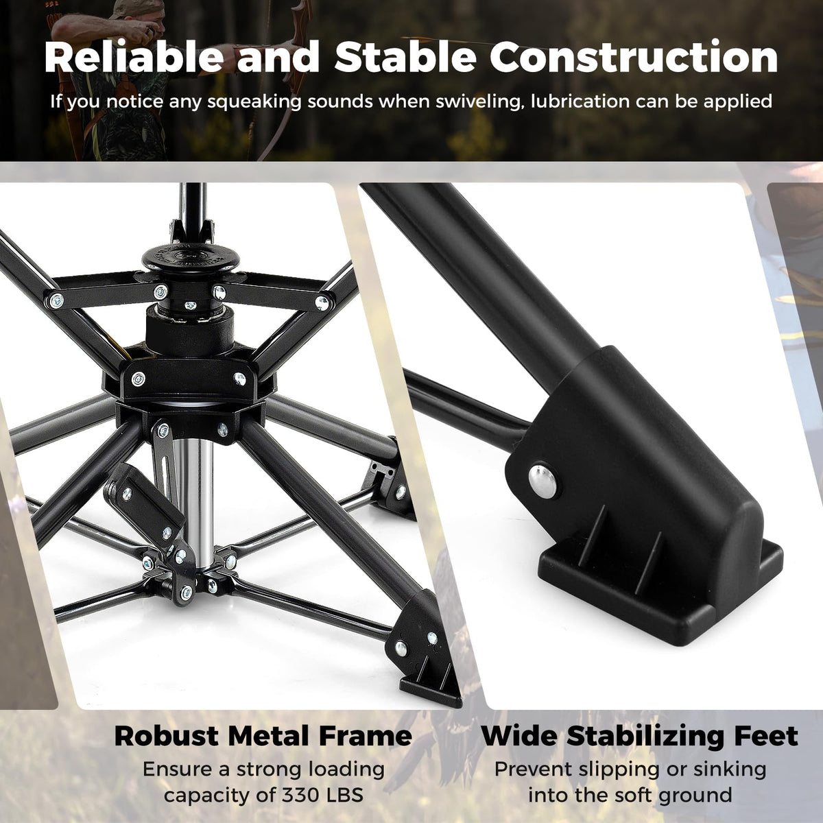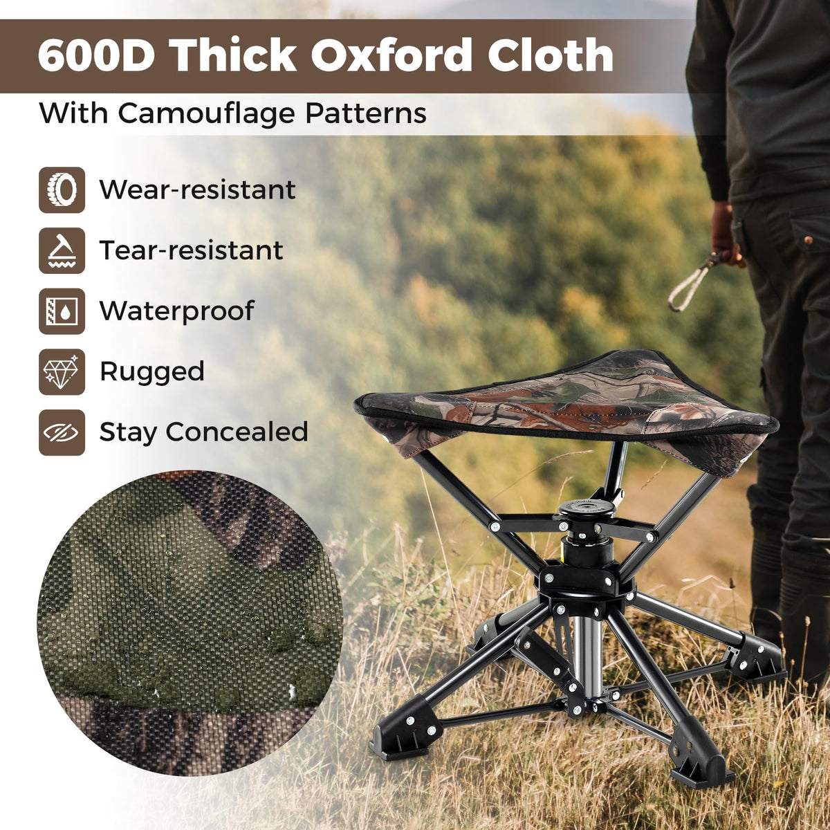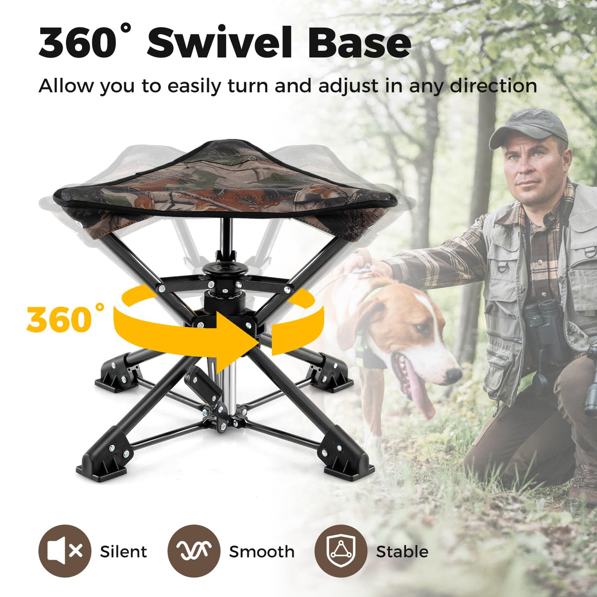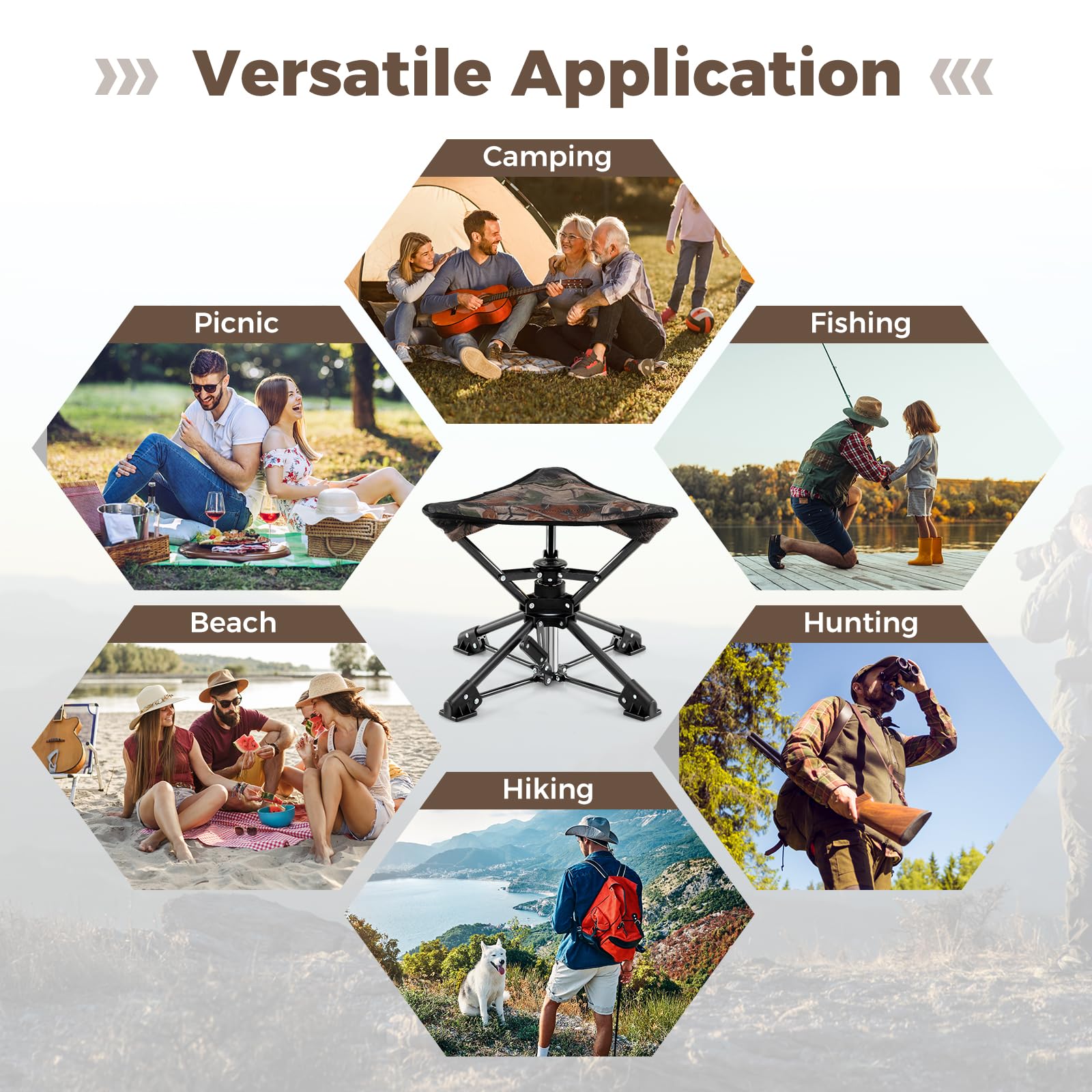 Our folding tripod camping stools boasts a 360° flexible rotating base that ensures a smooth and quiet movement, allowing you to easily turn and adjust in any direction. It is built with a sturdy metal frame and reinforced with 4 wide stabilizing feet, ensuring a stable and reliable seating option on a variety of terrains. Plus, the 600D oxford seat is both waterproof and tough enough to withstand the rigors of the outdoors, ensuring long-lasting performance. Folding and unfolding the stool is a breeze, simply press or step down to collapse it, and slip it into the included carrying bag for easy transportation and storage. Ideal for camping, fishing, hunting, and attending outdoor events, this portable stool combines convenience, comfort, and versatility to meet the needs of adventurers and casual users alike.