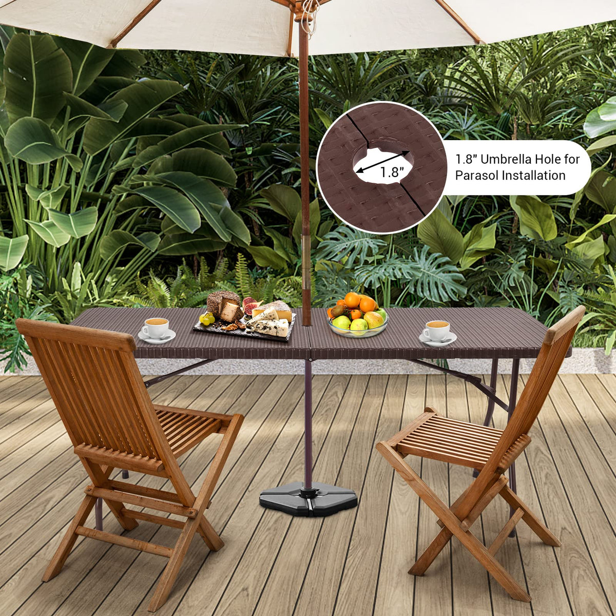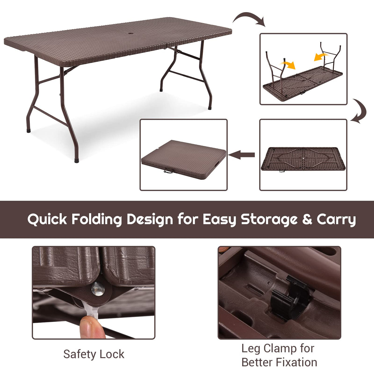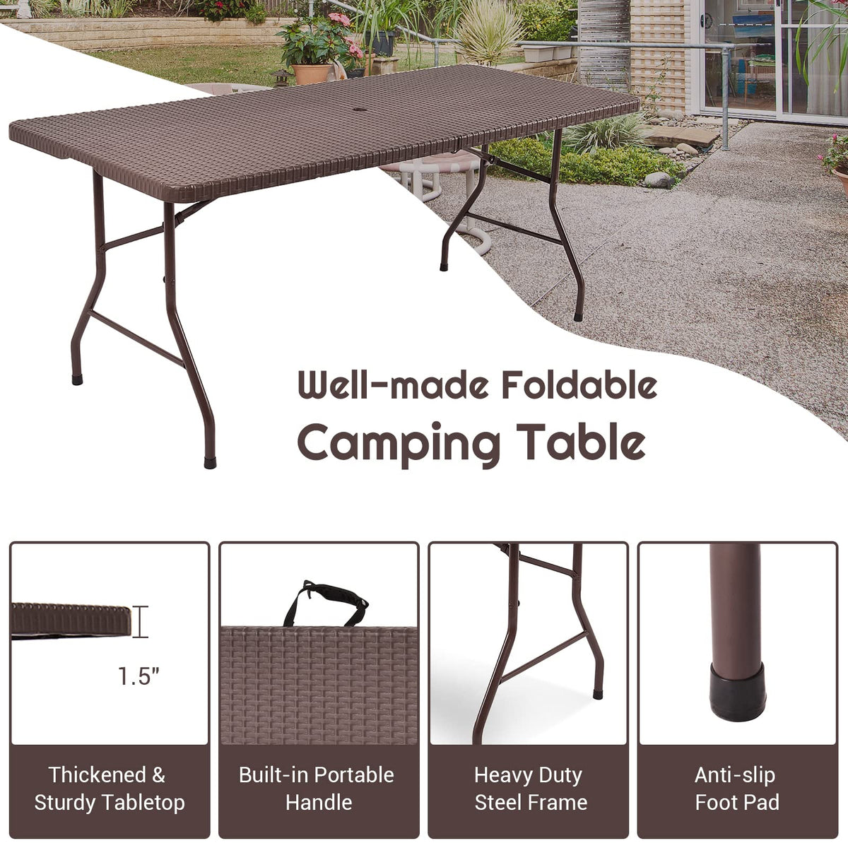 GYMAX 6FT Folding Table, Portable Lightweight Camping Table with Carry Handle (Rattan Tabletop with Umbrella Hole)