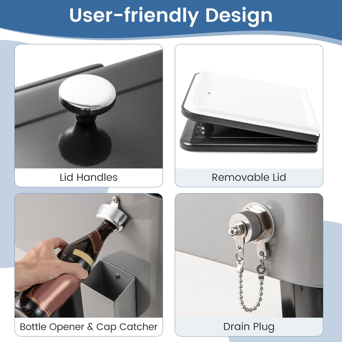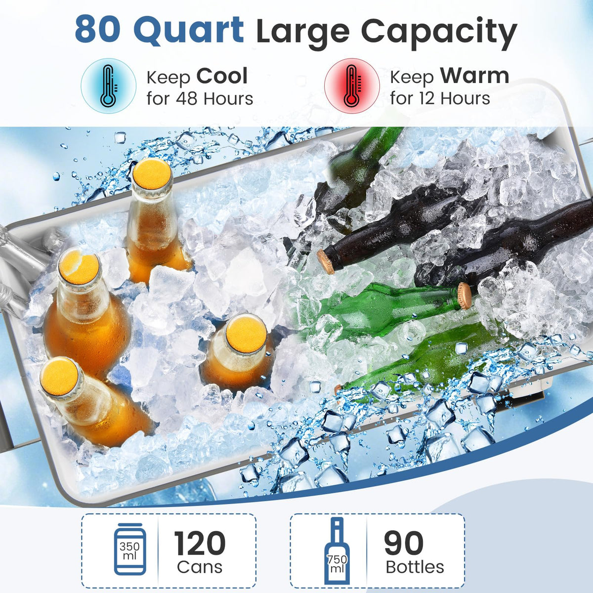 This 80 Quart large-capacity ice chest can store up to 120 cans or 90 bottles, making it an essential addition to your backyard barbecues and poolside parties. Its polyurethane foam insulation layer makes this ice chest keep cool for up to 48 hours or warm for up to 12 hours. The heavy-duty metal frame guarantees durability, while the powder-coated surface simplifies cleaning and maintenance. Designed for convenience, this cooler features 2 side handles and 4 universal wheels. The locking wheels provide stability, while the removable flip-top lid, built-in bottle opener, and drain outlet make accessing and cleaning up a breeze.