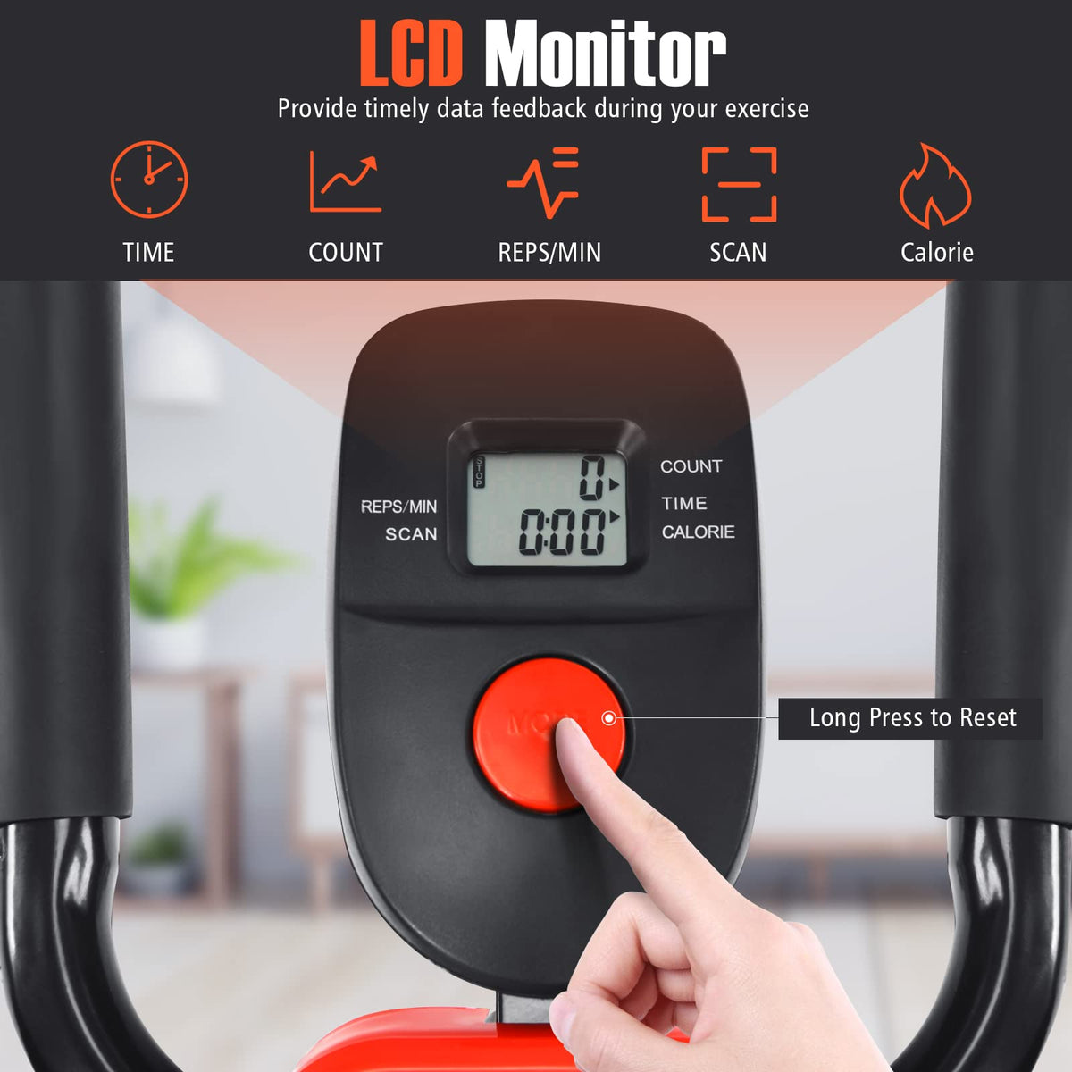 - Smart LCD Monitor: Equipped with an LCD monitor, this AB workout machine can show your real-time exercise data, including time, calories burnt, repetition counts and moves per minute. So you can track your workout process and adjust your tempo to have a more scientific workout. One piece of 1.5V AA battery is recommended to use (not included).