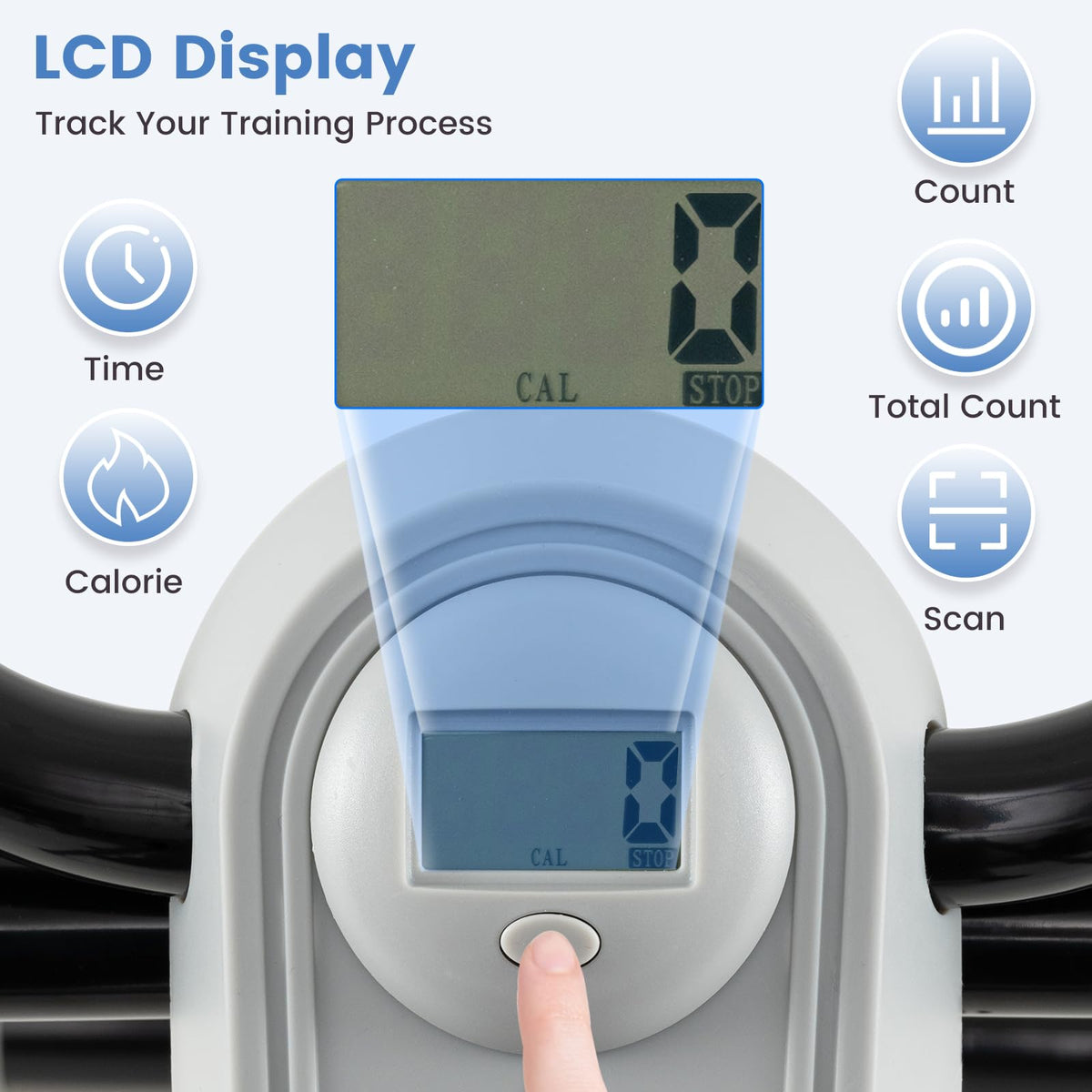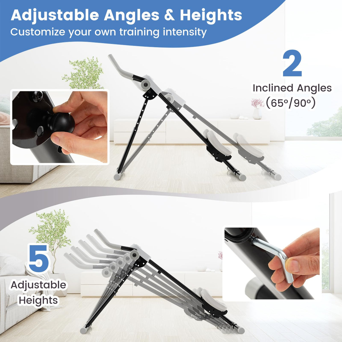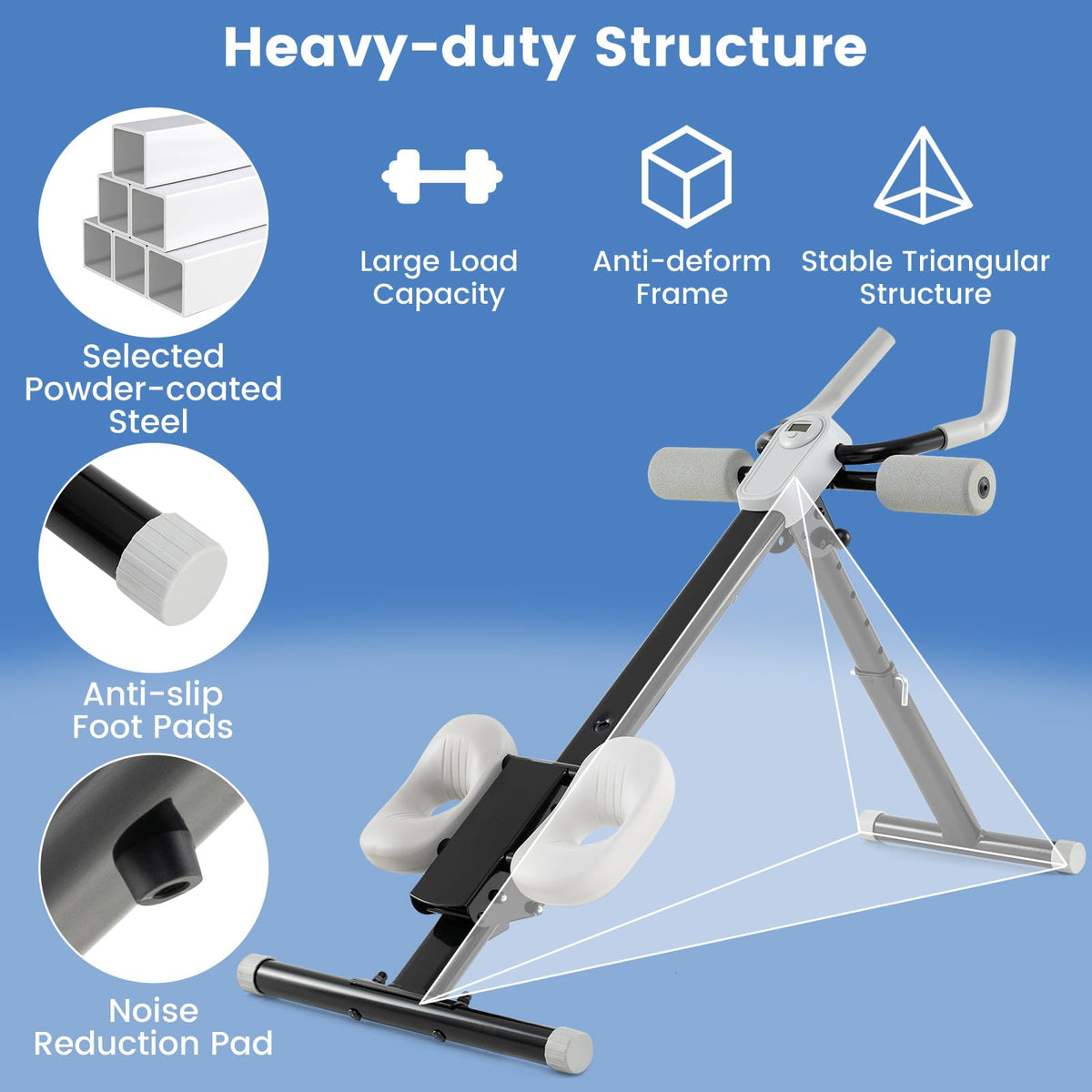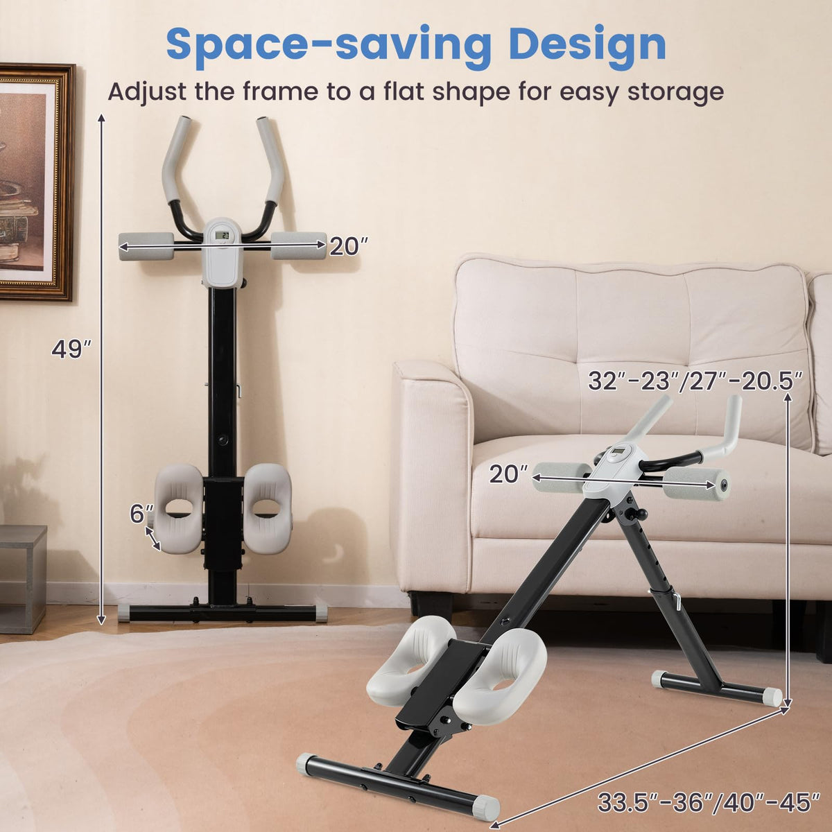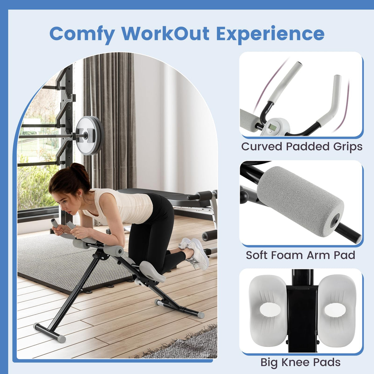 This versatile abdominal trainer provides a full-body workout targeting abs, arms, hips, and legs. Customize your routine with 2 incline angles (65°/90°) and 5 adjustable heights to match your fitness level and gradually increase intensity. Additionally, the LCD display tracks workout time, calories burned, and counts, offering real-time feedback. Use the scan feature for quick data overviews to monitor and adjust your progress. For comfort, it features padded grips, a foam arm pad, and knee pads. The premium wheels ensure smooth motion. Its triangular structure, combined with anti-slip foot pads and noise reduction pads, ensures a stable, quiet workout. Additionally, when not in use, you can fold it into a compact size for easy storage. Whether you're a fitness novice or a seasoned athlete, this ab trainer is an excellent addition to your home gym, helping you achieve your fitness goals efficiently and effectively.