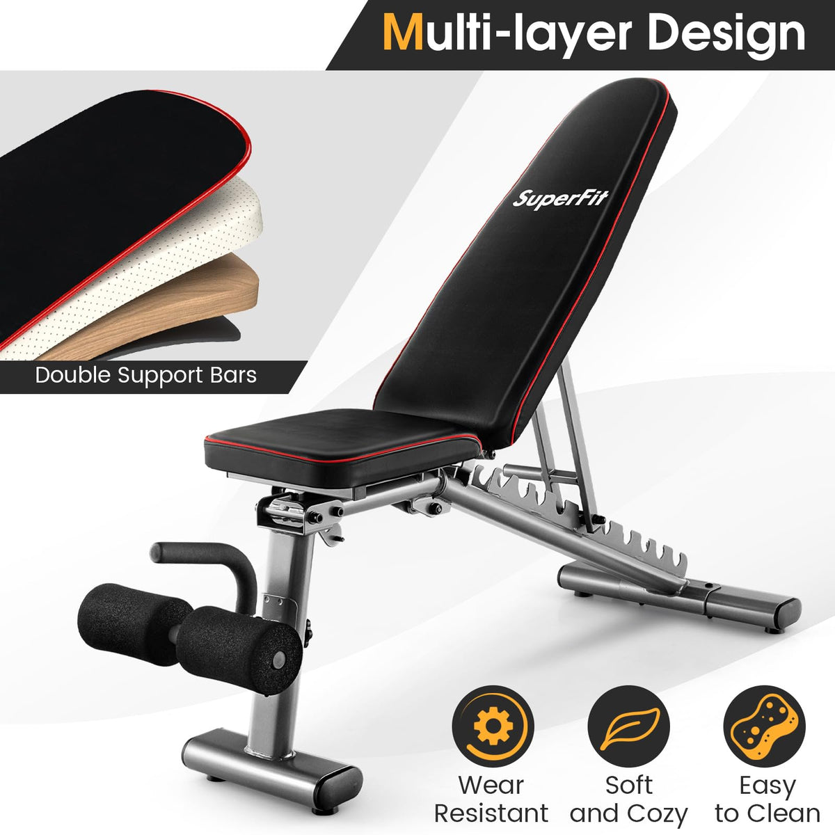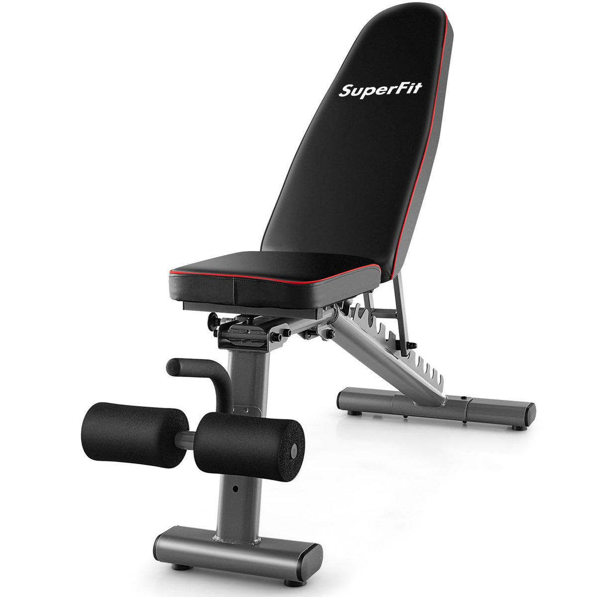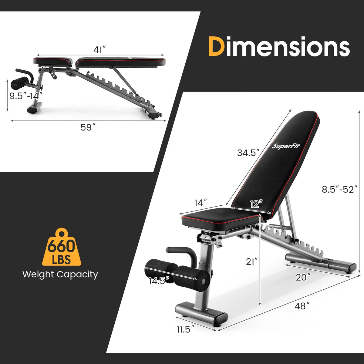 Enjoy your workout just at home with our adjustable weight bench!Supported by sturdy metal pipes with heavy-duty construction, the adjustable strength training bench holds 660 lbs. With the adjustable backrest, seat and foot, this bench press features incline, decline or flat angle for backrest, enabling you to exercise the whole body. Additionally, the soft back and seat cushions as well as foam wrapped foot holders provide a comfortable exercise experience.
