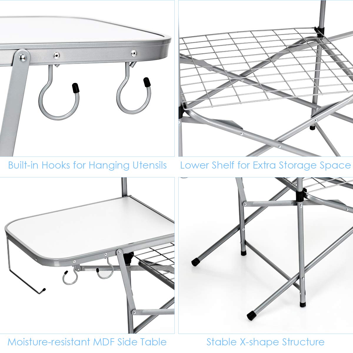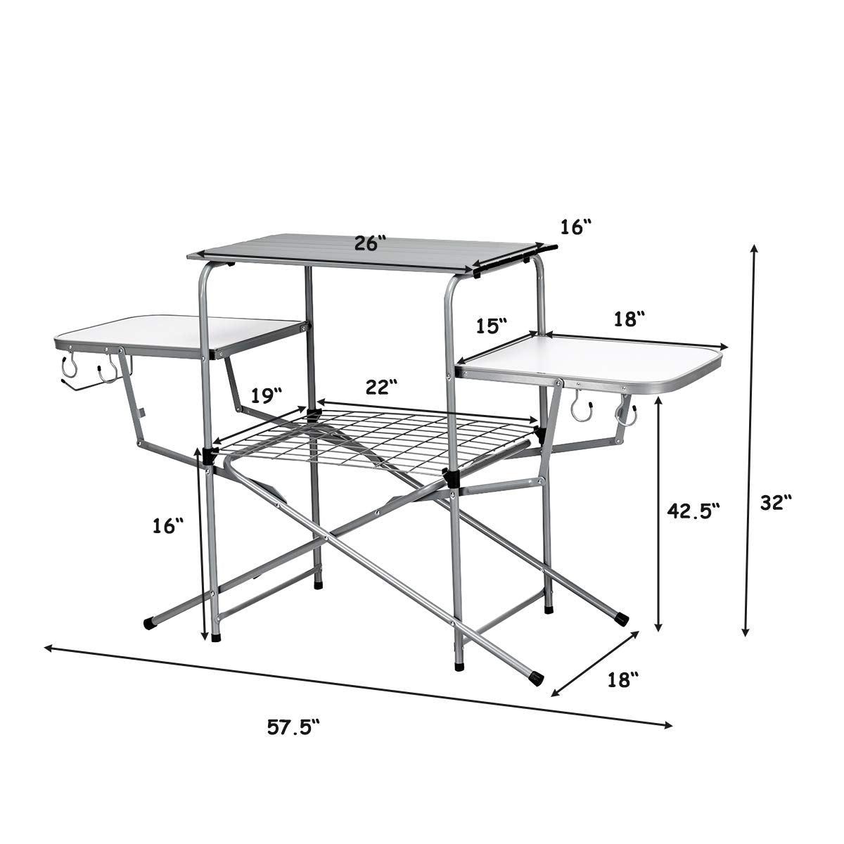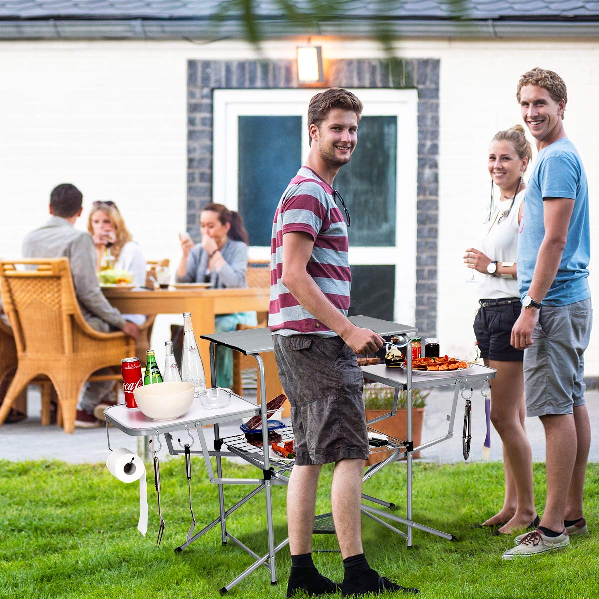 - 【Roomy Storage Space Design】With 3 spacious tabletops, 1 lower wire rack, 4 hanging hooks and 1 paper towel holder, GYMAX camp folding table features a spacious space for convenient storage, so that your grilling necessities are always at your arm’s reach.
