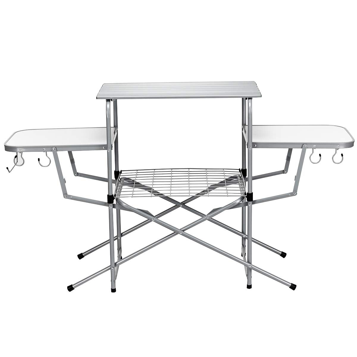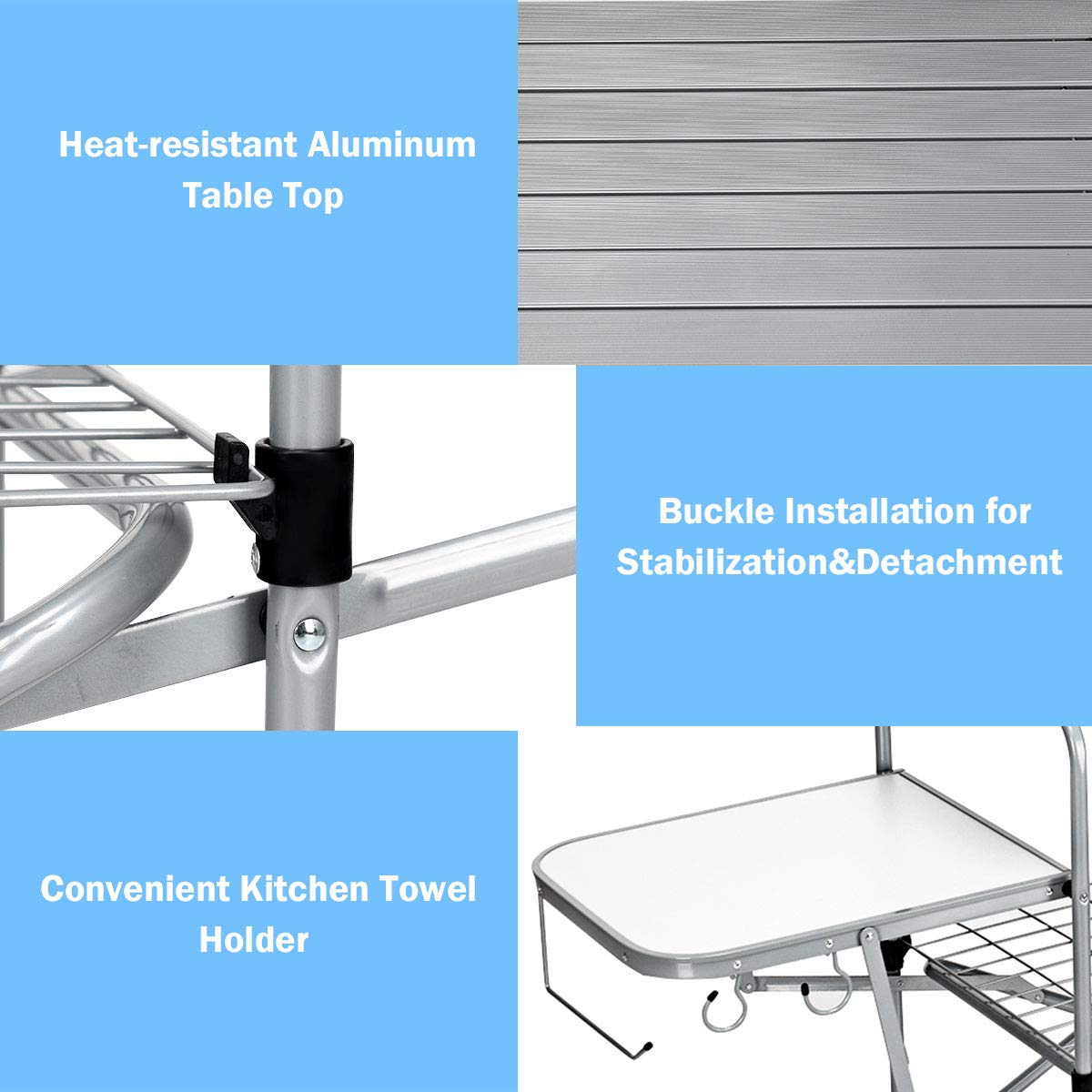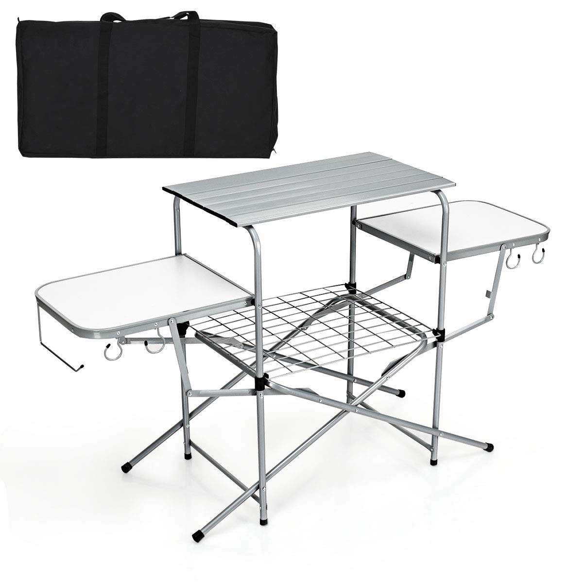 - 【Roomy Storage Space Design】With 3 spacious tabletops, 1 lower wire rack, 4 hanging hooks and 1 paper towel holder, GYMAX camp folding table features a spacious space for convenient storage, so that your grilling necessities are always at your arm’s reach.