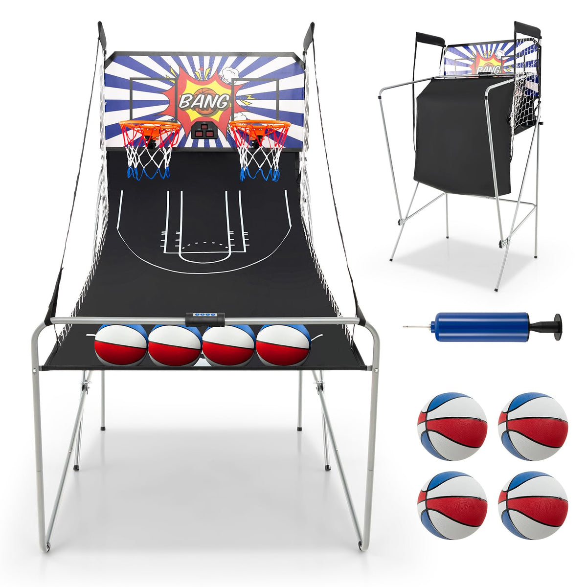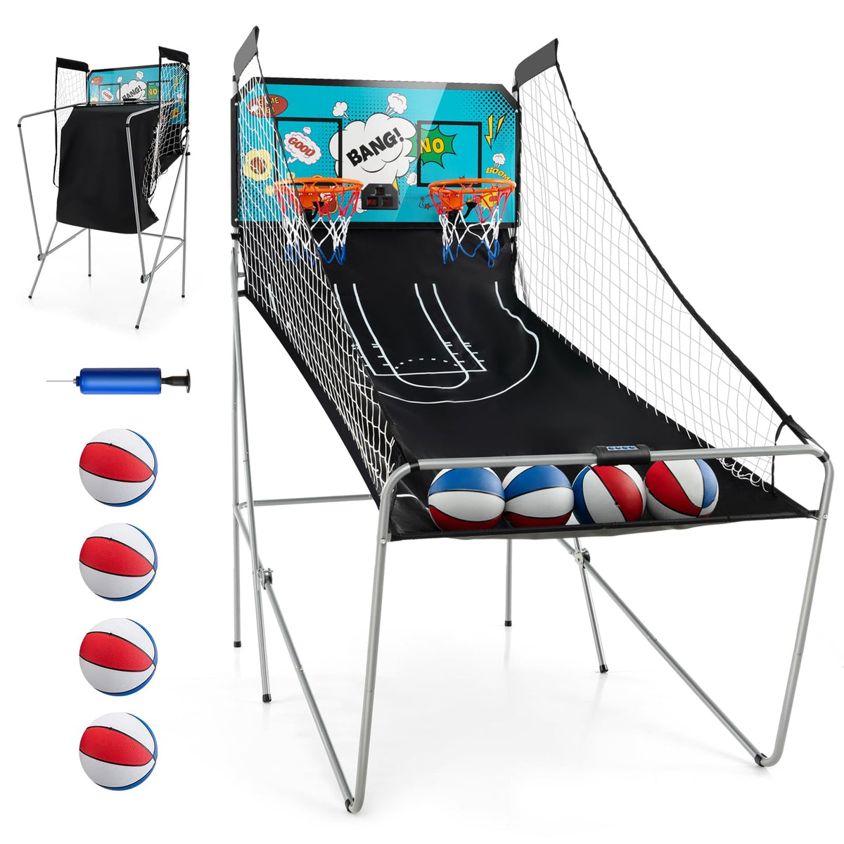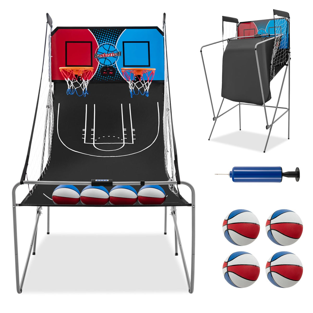 - Fun for All Ages: This folding dual shot basketball arcade game is the perfect addition to any game room, basement, or backyard. It is suitable for 1-4 players and has 8 game modes with sound effect: beat the time clock, 3-point beat the time clock, battle back, horse, check point, around the world, left and right shoot and one to one.