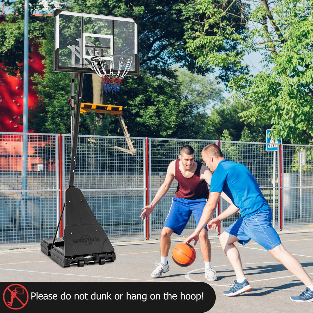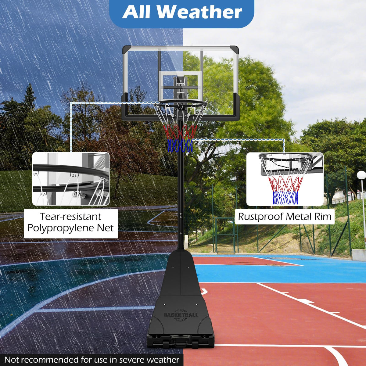 - All Weather Use: Crafted from rustproof metal rim and poles, tear-resistant polypropylene net, weather-resistant PE base and PC backboard, this basketball hoop allows you to enjoy basketball in any season. Please note: not recommended for use in severe weather.