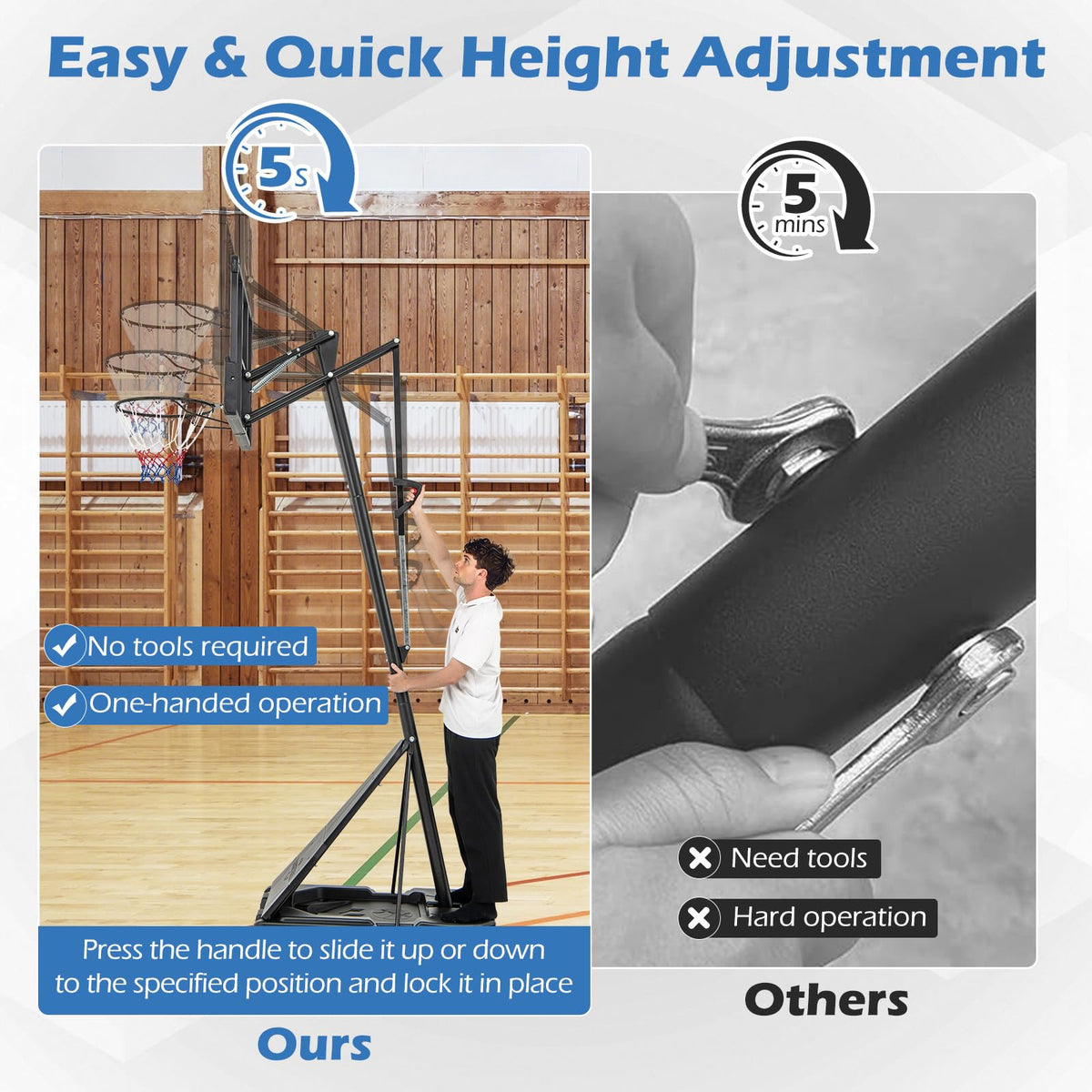 - Grip & Pull Height Adjustment: Catering to both kids and adults, this portable basketball hoop features 10-level adjustable height: 8-10 ft (install 3 tubes), 4.9-6.9 ft (install 2 tubes). Plus, the height adjustment is effortless and tool-free, just press the handle to slide it up or down to the specified position and lock it in place.