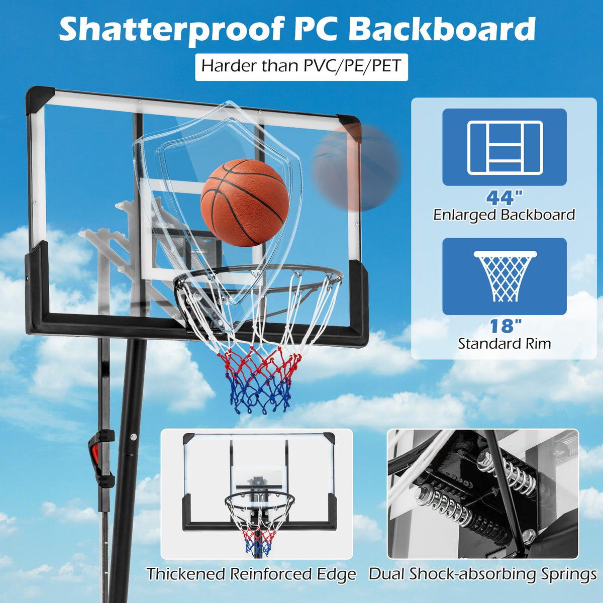 - 44" Enlarged Backboard: This adjustable basketball hoop features a 44" shatterproof PC backboard, which is harder than PVC/PE/PET. Along with thickened reinforced edge and dual shock-absorbing springs, it is able to withstand vigorous play.