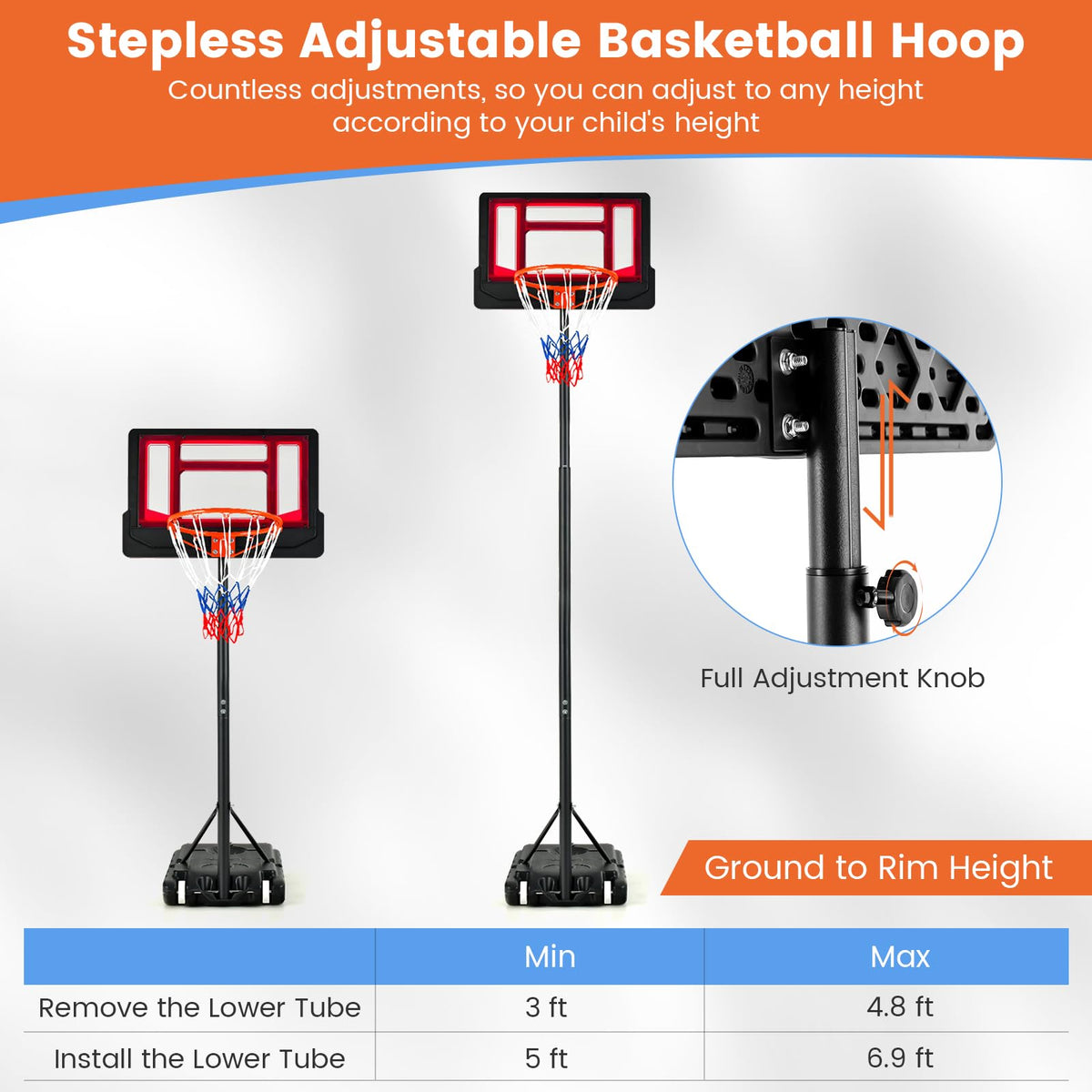 - Flexible Stepless Adjustments: Featuring a new and easy adjustment by turning the knob and pulling the tube, the basketball hoop achieves countless adjustments (5 ft to 6.9 ft from floor to rim). No more fixed height, you can adjust to any height according to your child's height. There is a removable middle tube to help you reach lower heights. After removing the tube, you can get the height of 3 ft-4.8 ft (ground to rim)/ 4.3 ft-6.1 ft (ground to backboard).