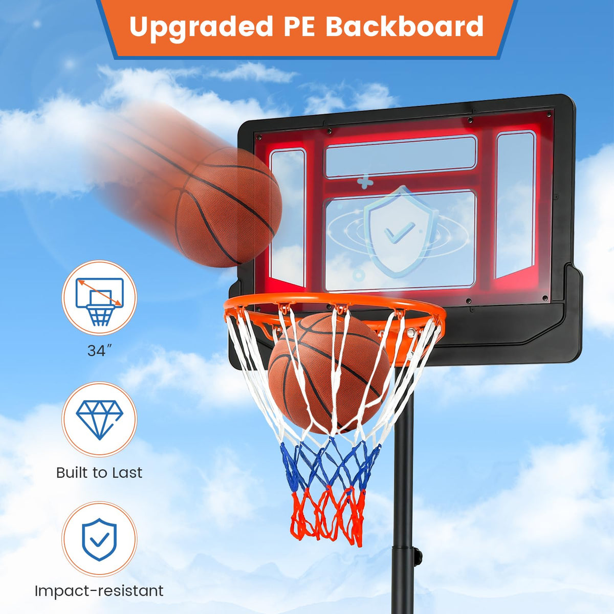 - All Weather Basketball Hoop: Made of a powder-coated metal frame and high-quality polypropylene net, this basketball hoop can withstand any weather conditions, no matter rainy day or sunny day. 34" upgraded PE backboard is built to last and impact-resistant, able to withstand thousands of shooting sessions without deformation.