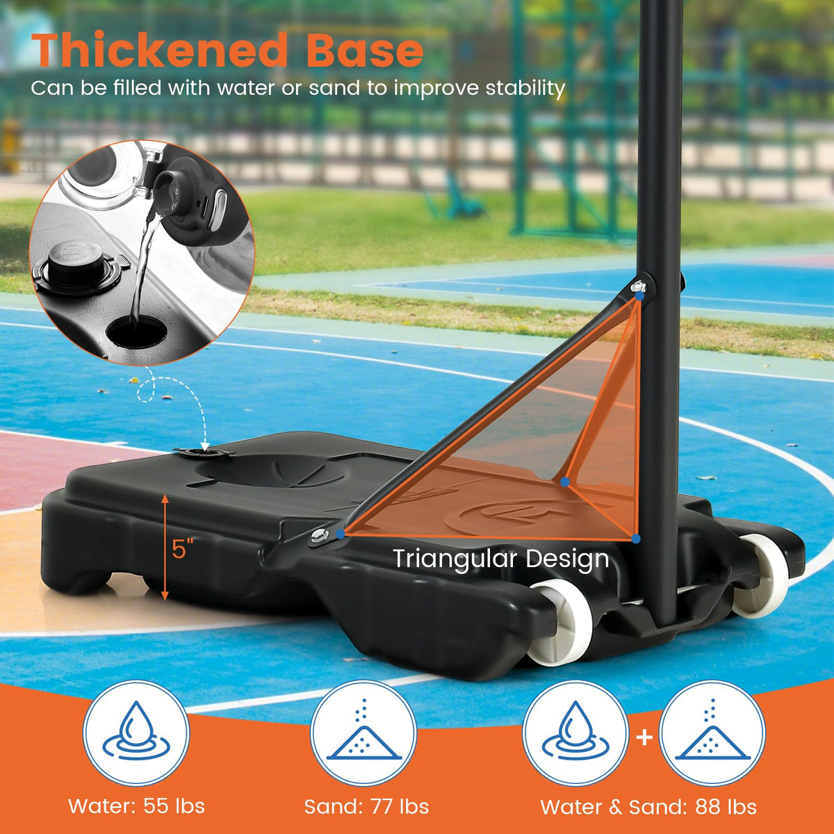 - Outstanding Stability: This basketball hoop comes with a 5" thickened base, which can be filled with water or sand to improve stability and safety (water: 55 lbs; sand: 77 lbs; water & sand: 88 lbs). The triangular design of the base provides a firm support, and reinforced hardware connections ensure tightness of the main pole.