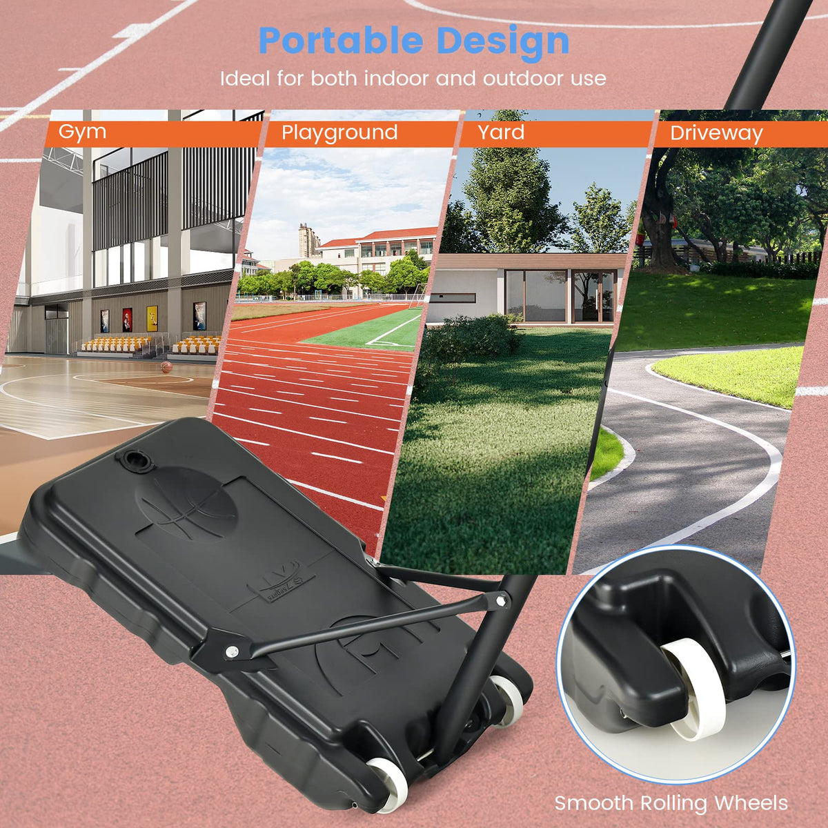 - Indoor & Outdoor Available: Fitted with 2 smooth rolling wheels, this basketball hoop is easy to move around, ideal for both indoor and outdoor activities. You can place it in the driveway, yard, playground, gym, basketball court etc. What a perfect gift for kids in sports games, family gatherings, school events and so on!