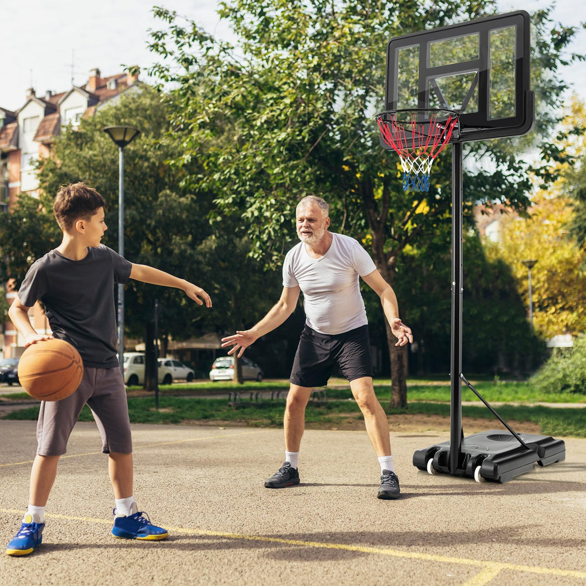 - Fillable Stable Base with Wheels: The connection between the pole and base forms a stable triangular structure. The reinforced HDPE base is fillable with 13.2 gal water, 165 lbs sand or 110 lbs sand plus 2.6 gal water for higher stability. And the concave on the base is perfect for basketball storage. In addition, the 2 built-in wheels are designed for effortless movement.