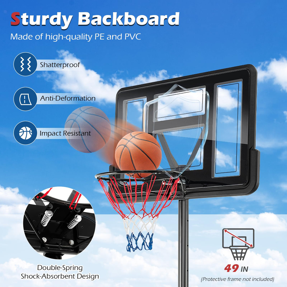 - Large Shatterproof Backboard: Made of high-quality PE and PVC, the 49” backboard (in diagonal) is shatterproof, impact resistant and not easy to deform. And the instant rebound makes you play the basketball more intently. Plus, the double-spring shock-absorbent design makes the basket rim much sturdier.