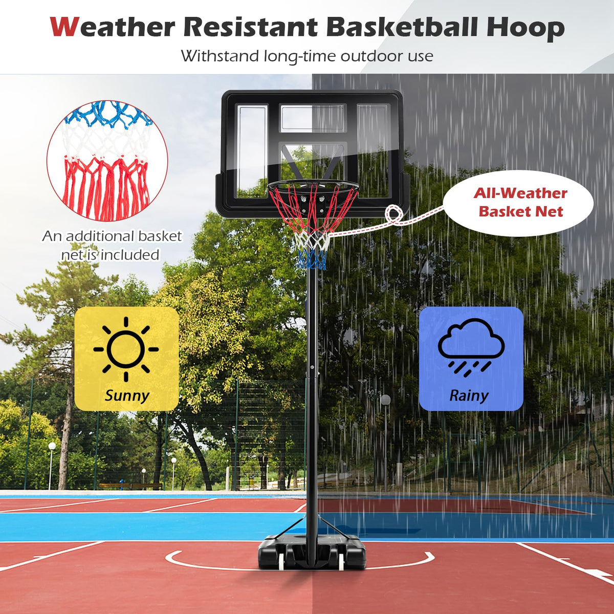 - Weather Resistant Basketball Stand: The basketball hoop is mainly constructed of heavy-duty metal, which is anti-deformation and rust resistant. The basket rim with durable net also resists well to different weather. Therefore, this basketball hoop system is ideal for both indoor and outdoor use.