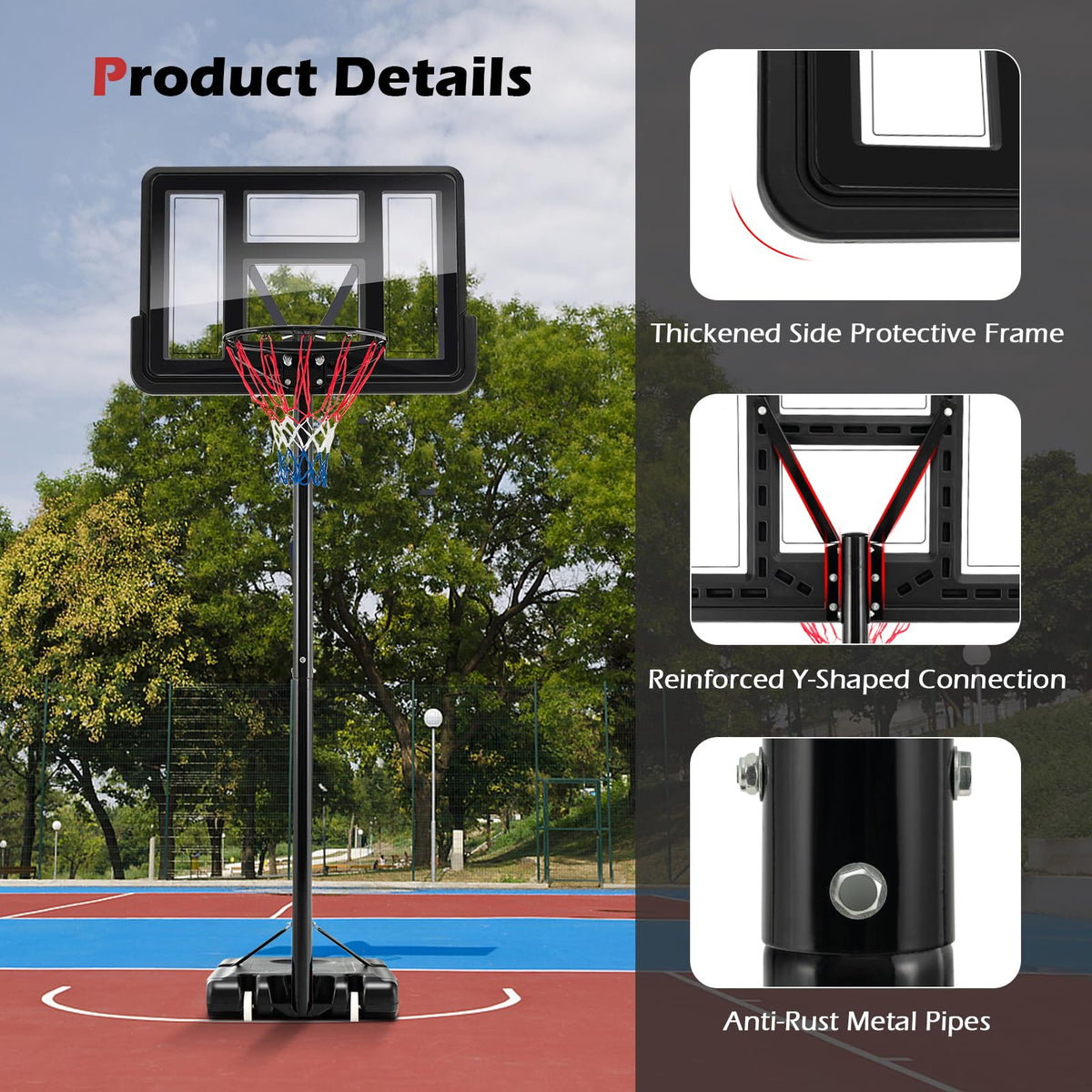 - 12-Level Adjustable Height: Featuring 4.25-10 ft adjustable height from the basketball rim to the floor, this basketball goal perfectly satisfies the demands of people with different heights. You just need to detach/attach supporting pole or change the hole position for adjustment.