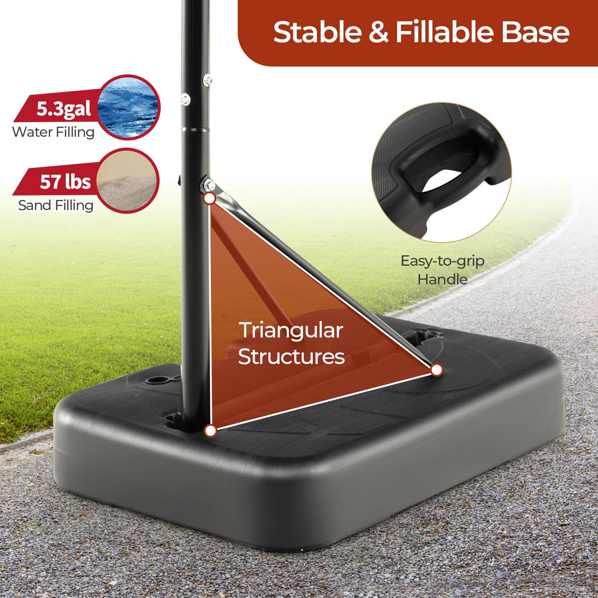 - Stable & Fillable Base: The triangular structure provides strong support that contribute to the overall stability of the basketball hoop as you shoot. Plus, the base can be filled with either 5.3 gallons of water or 57 lbs of sand to help prevent the hoop from tipping over during aggressive play or windy conditions.