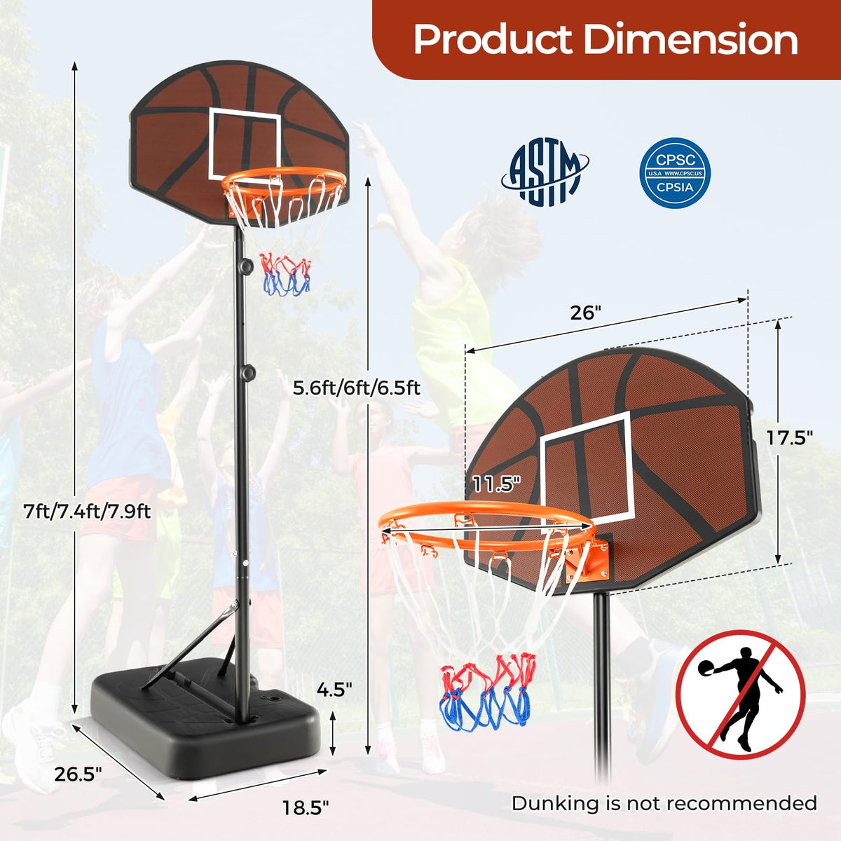- 3-Level Adjustable Height: This basketball hoop stand features a 3-level height design, which aims to help your kids improve skills and confidence as they grow. The height is easy to adjust with knobs – no additional tools required. Height from ground to rim: 5.6 ft/6 ft/6.5 ft; Height Overall: 7 ft/7.4 ft/7.9 ft.