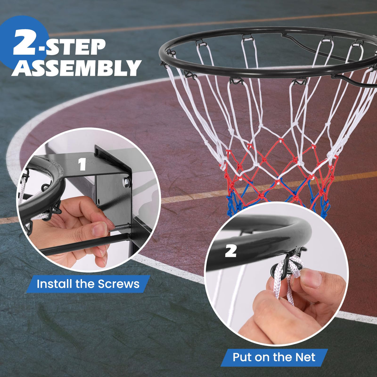 - 2-step Assembly with Hardware: Installing this basketball hoop replacement is simple with the included hardware kit. Just follow two steps: ① Identify the four mounting positions and tighten the screws. ② Attach the net and start shooting.