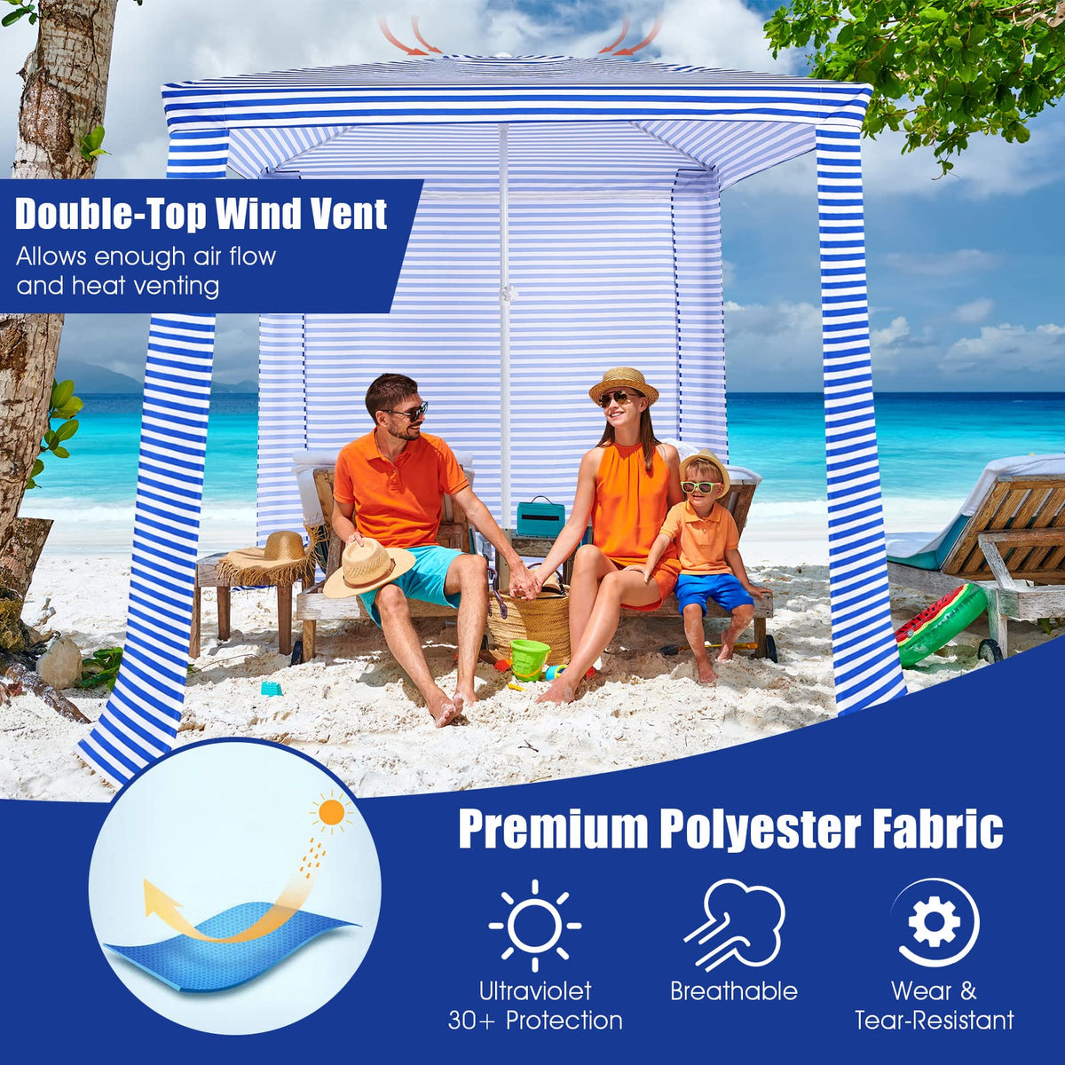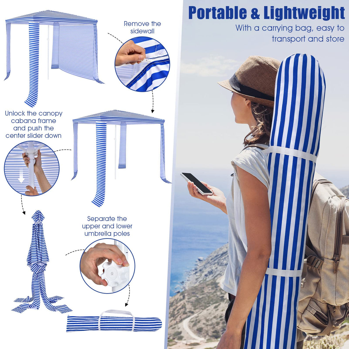 - Super Easy Setup & Take Down: GYMAX beach cabana is easy and quick to set up, just push the center slider up to raise and lock the canopy cabana frame. Meanwhile, this portable cabana can be folded in a compact size and stored in the carrying bag effortlessly as well, perfect for storage and transport.