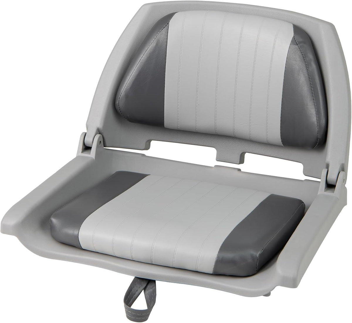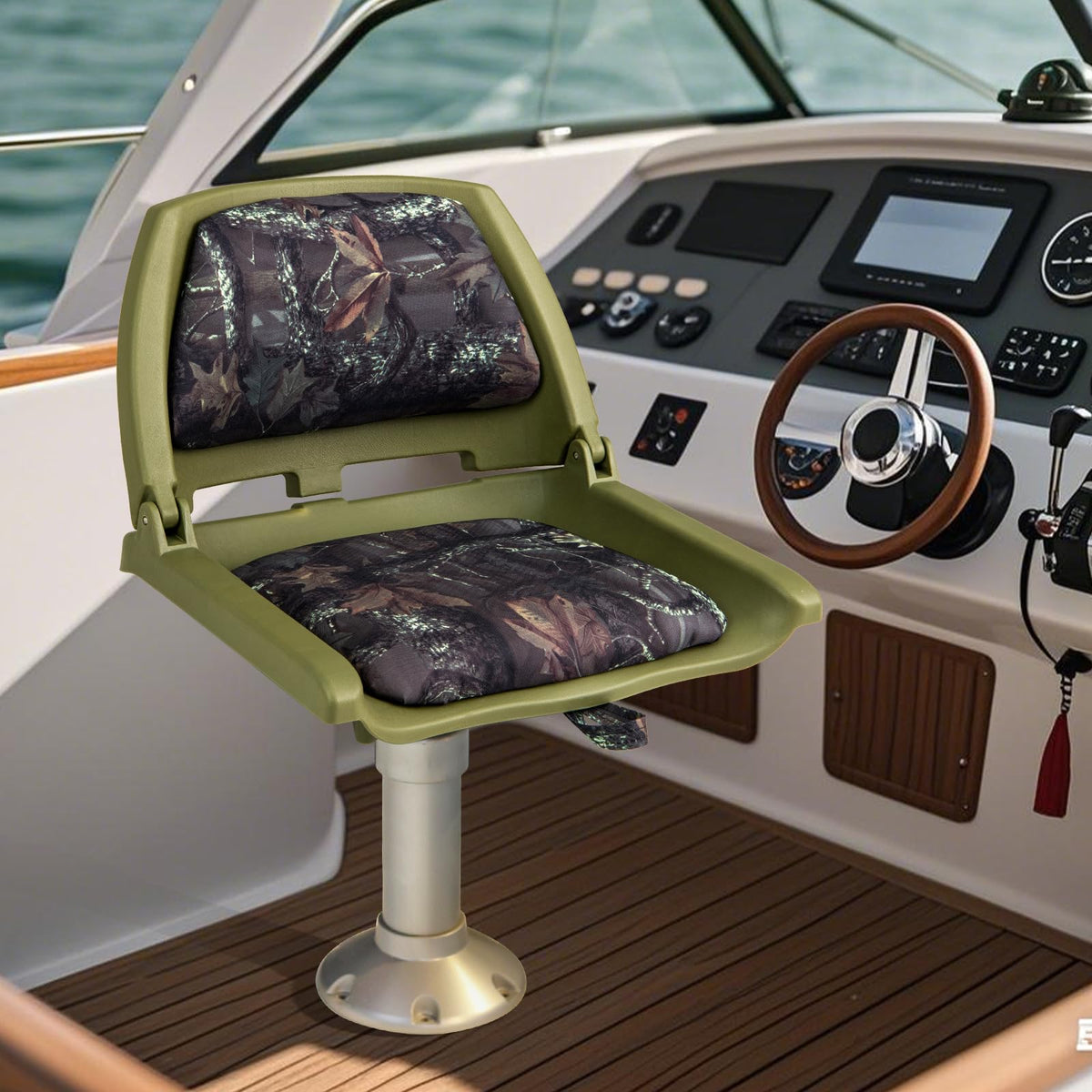 This fishing boat seat boast an upholstered seat and back, filled with high-density sponge cushion for exceptional comfort during long hours on the water. Crafted from marine-grade PVC fabric, it's reinforced to withstand wear and tear, resistant to fading, and easy to clean. Besides, with a high-strength PP frame and sturdy hinges, this seat offers robust support with a 330 lbs load capacity. Its foldable and lightweight design, complete with a secure strap for easy storage, makes it portable and convenient to take anywhere. It can be mounted on 5" x 5" boat pattern swivels or pedestals, suitable for various vessels like fishing boats, sightseeing boats, kayaks, and jon boats.