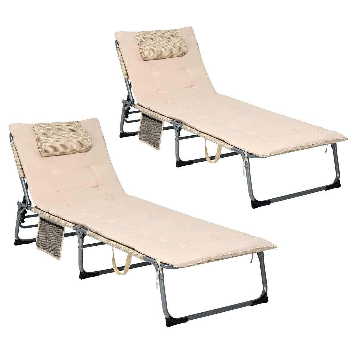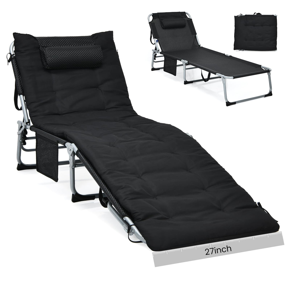 GYMAX Camping Cot, 27” Lounge Chair Outdoor w/Mattress, Headrest, Side Pocket & Carry Strap, 3 in 1 Folding Layout Tanning Lounger