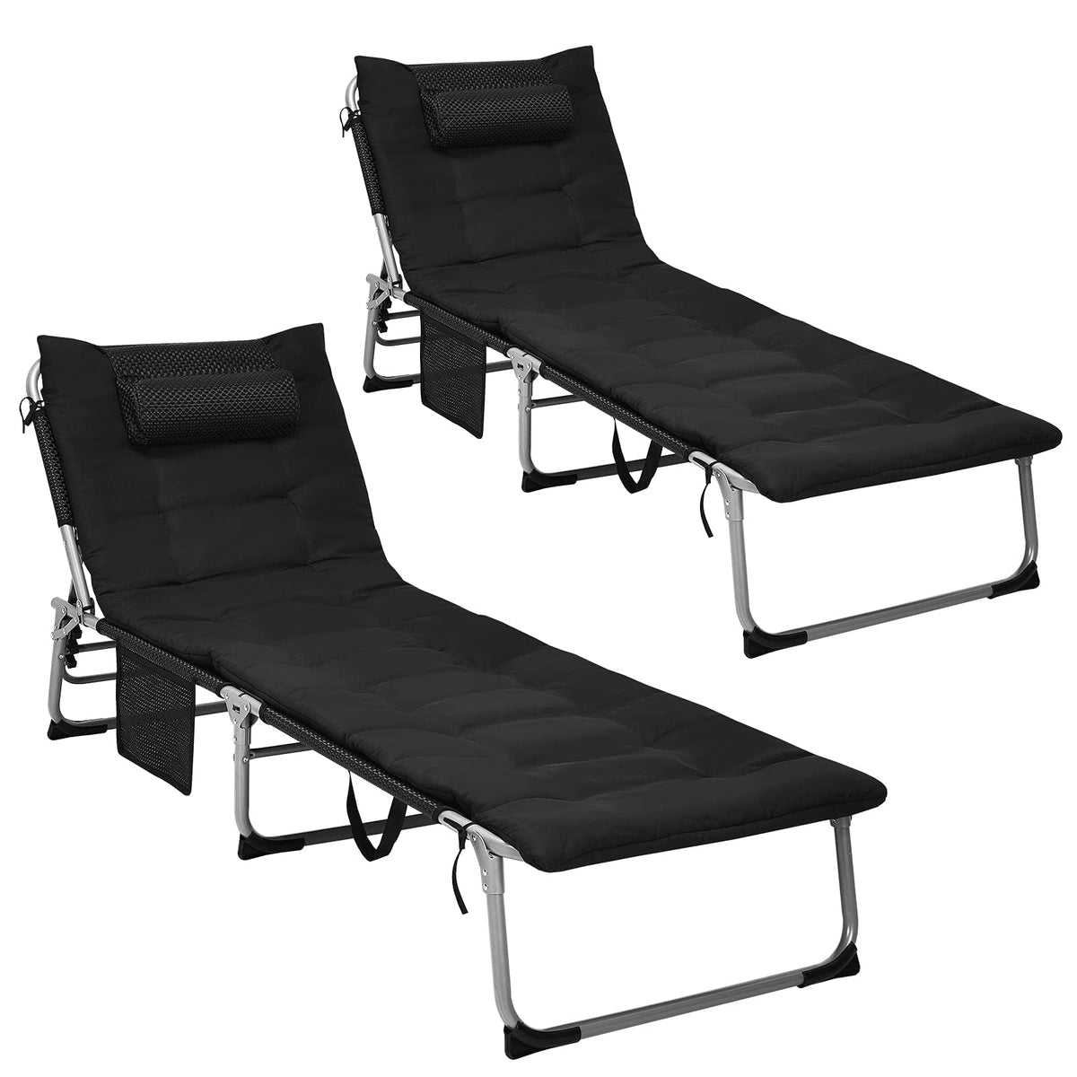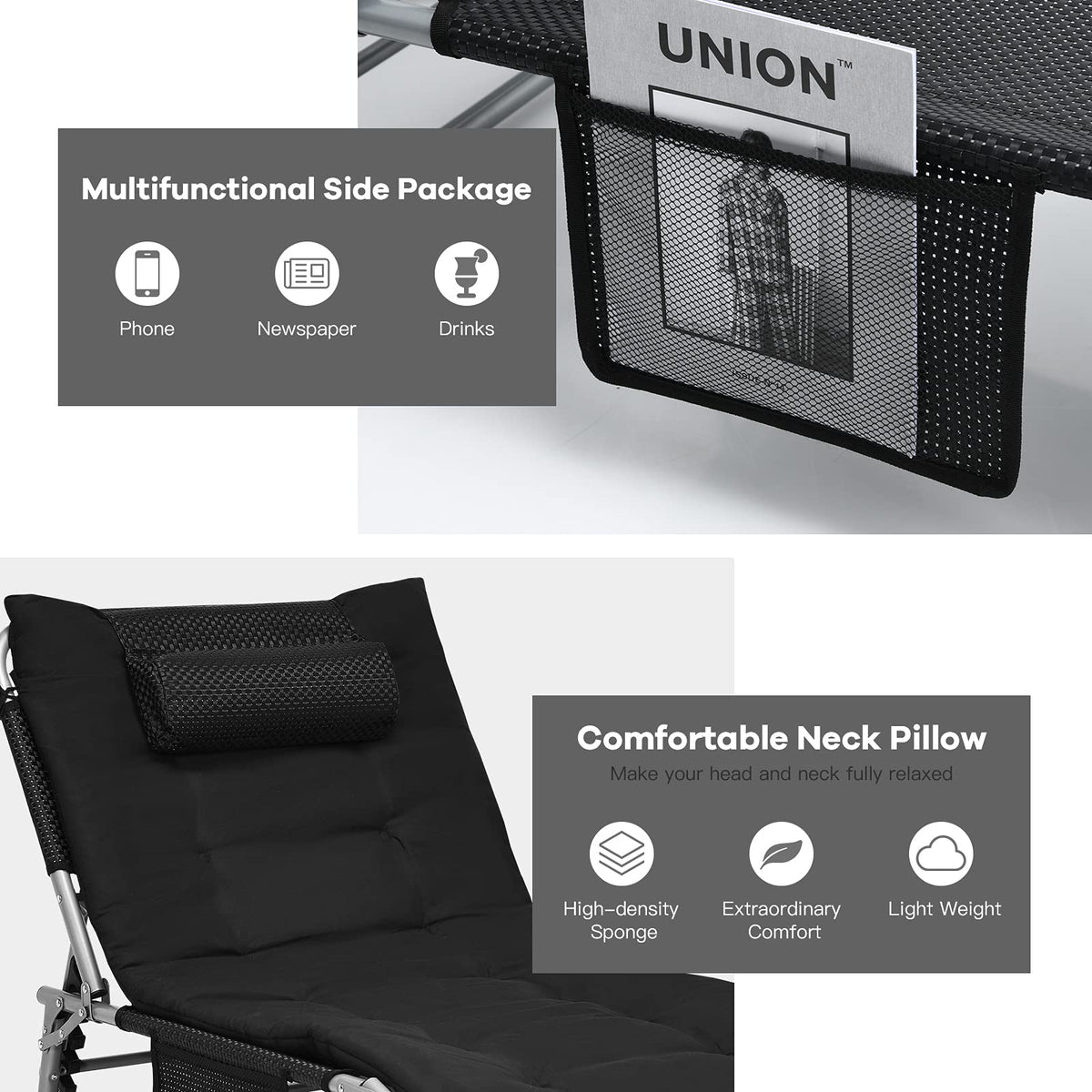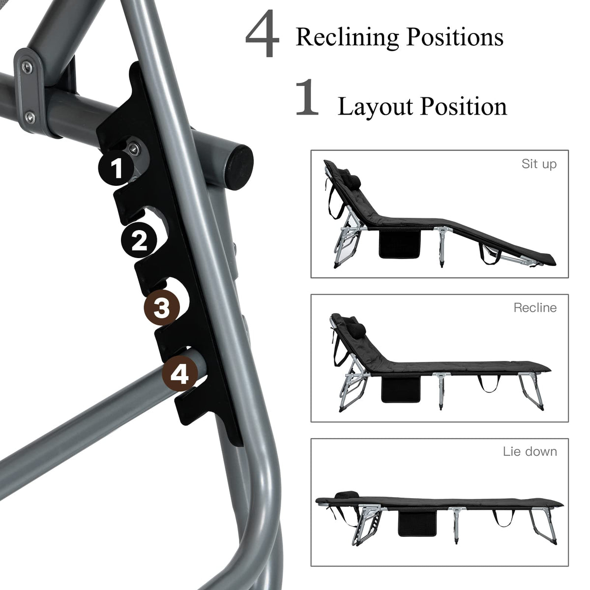 - Adjustable Backrest & Footrest: Unlike normal camping cots, GYMAX folding chaise lounge features 5-level backrest and 2-level footrest, which allows you sit and recline comfortably. And surly, this outdoor lounger can be laid flat for nap or sleeping.