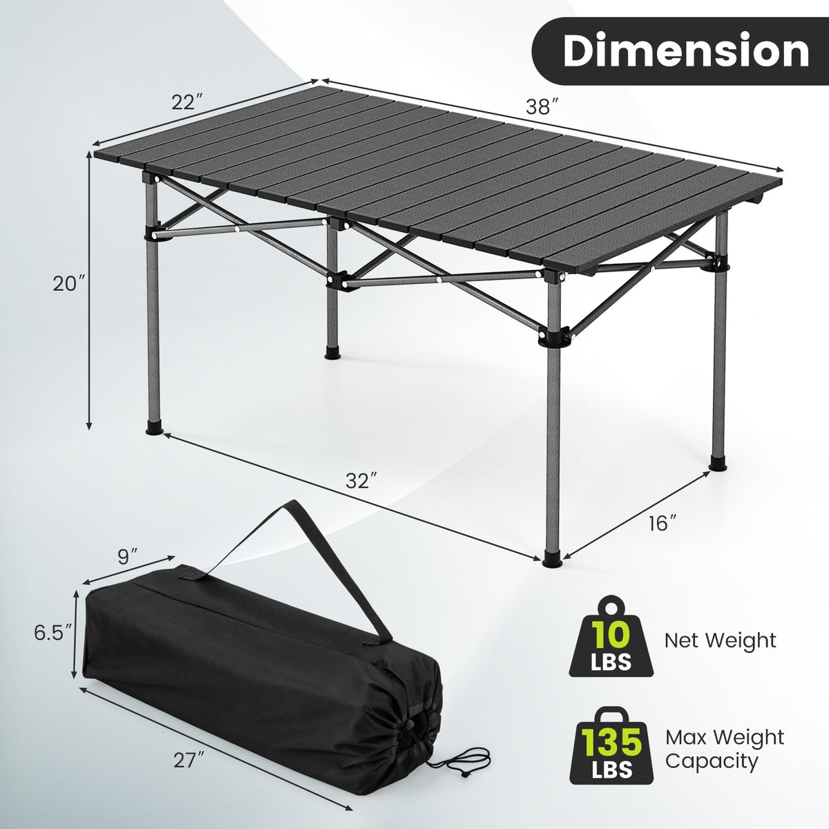 Size of Camping Table: 38" x 22" x 20" (L x W x H)