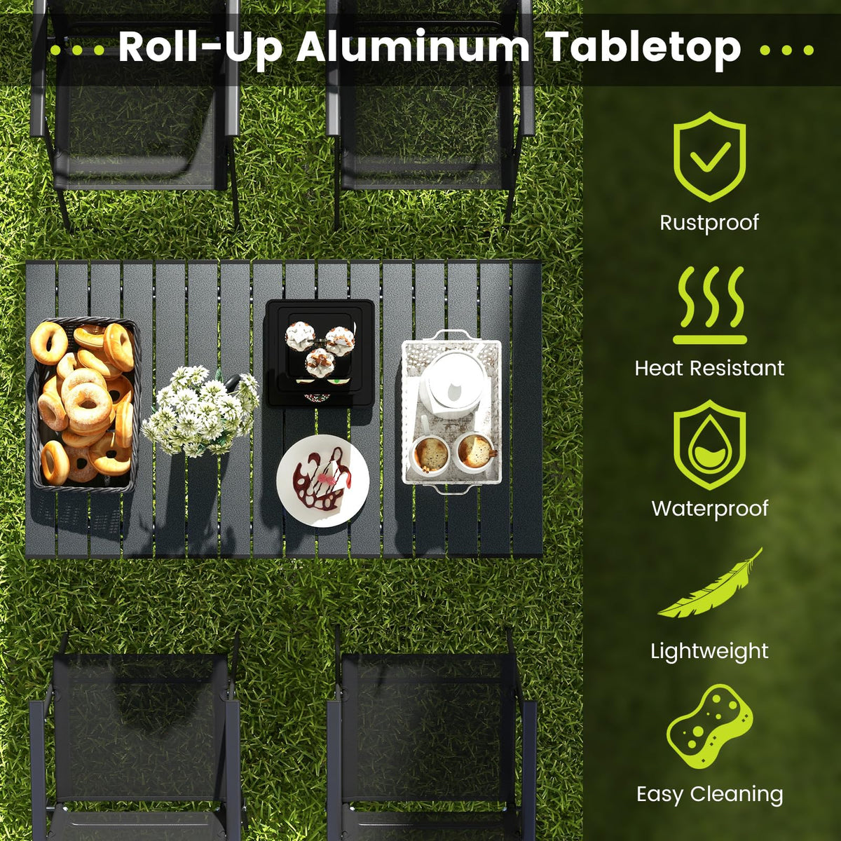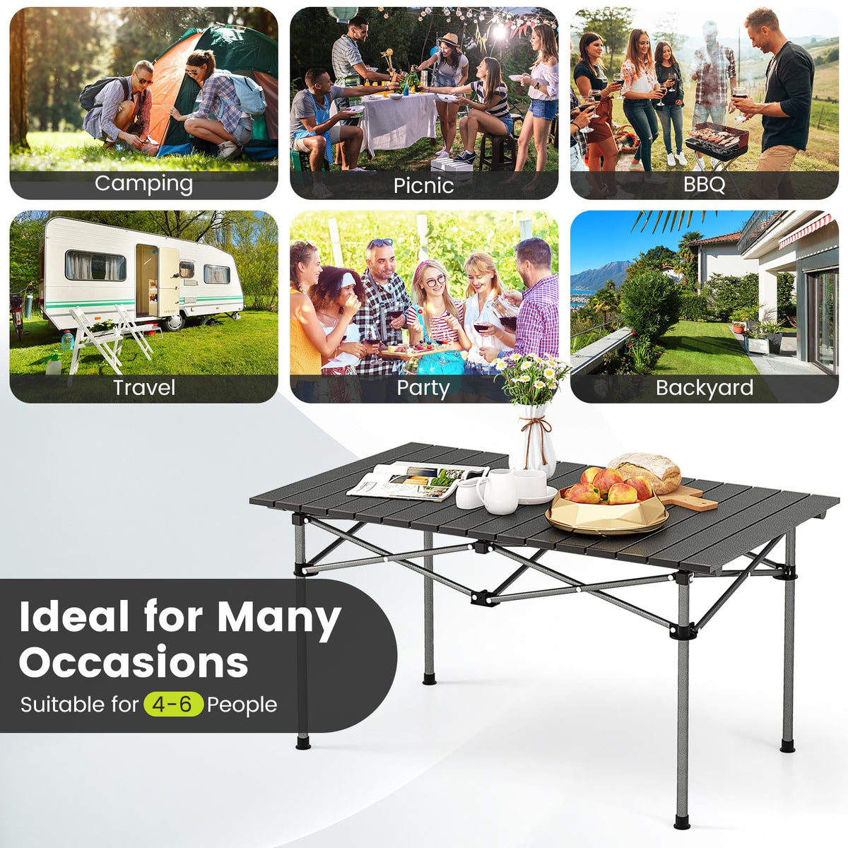 - Premium Aluminum Tabletop: The roll-up tabletop is made of quality aluminum that is heat-resistant and rustproof, suitable for hot dishes and beverages. The spacious tabletop can hold a lot of food, perfect for 4-6 people gathering around. And the waterproof surface makes cleaning a breeze.