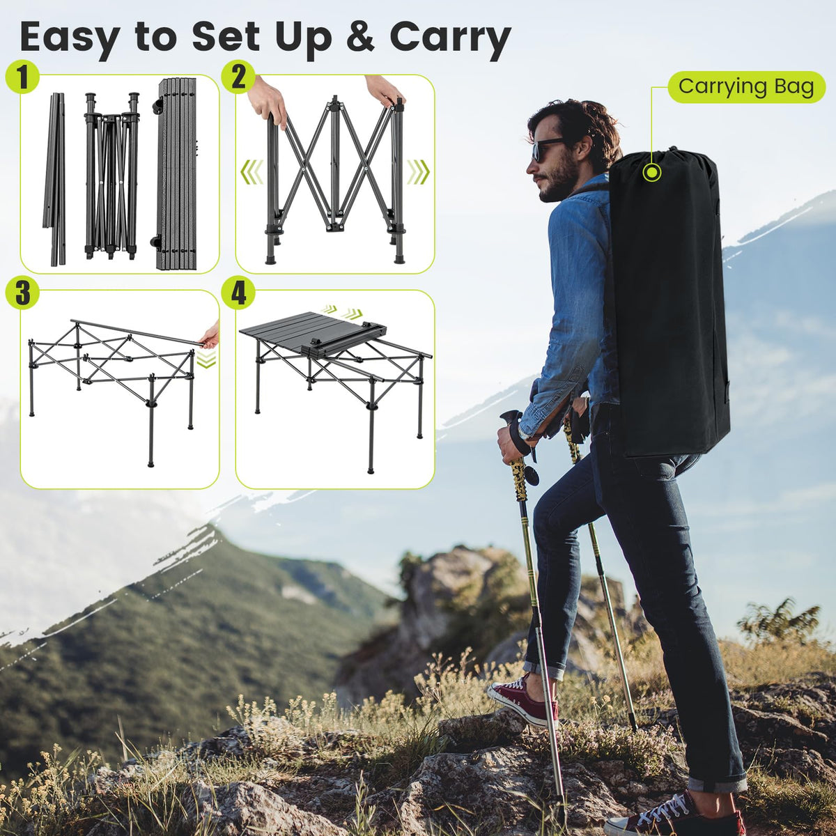 - Portable and Lightweight Design: Our portable camping table features a roll-up tabletop and foldable frame, which can be stored in an included carrying bag. Its compact size allows for effortless storage in your car trunk. And the aluminum table is lightweight, making it easy to carry during your next camping adventure.