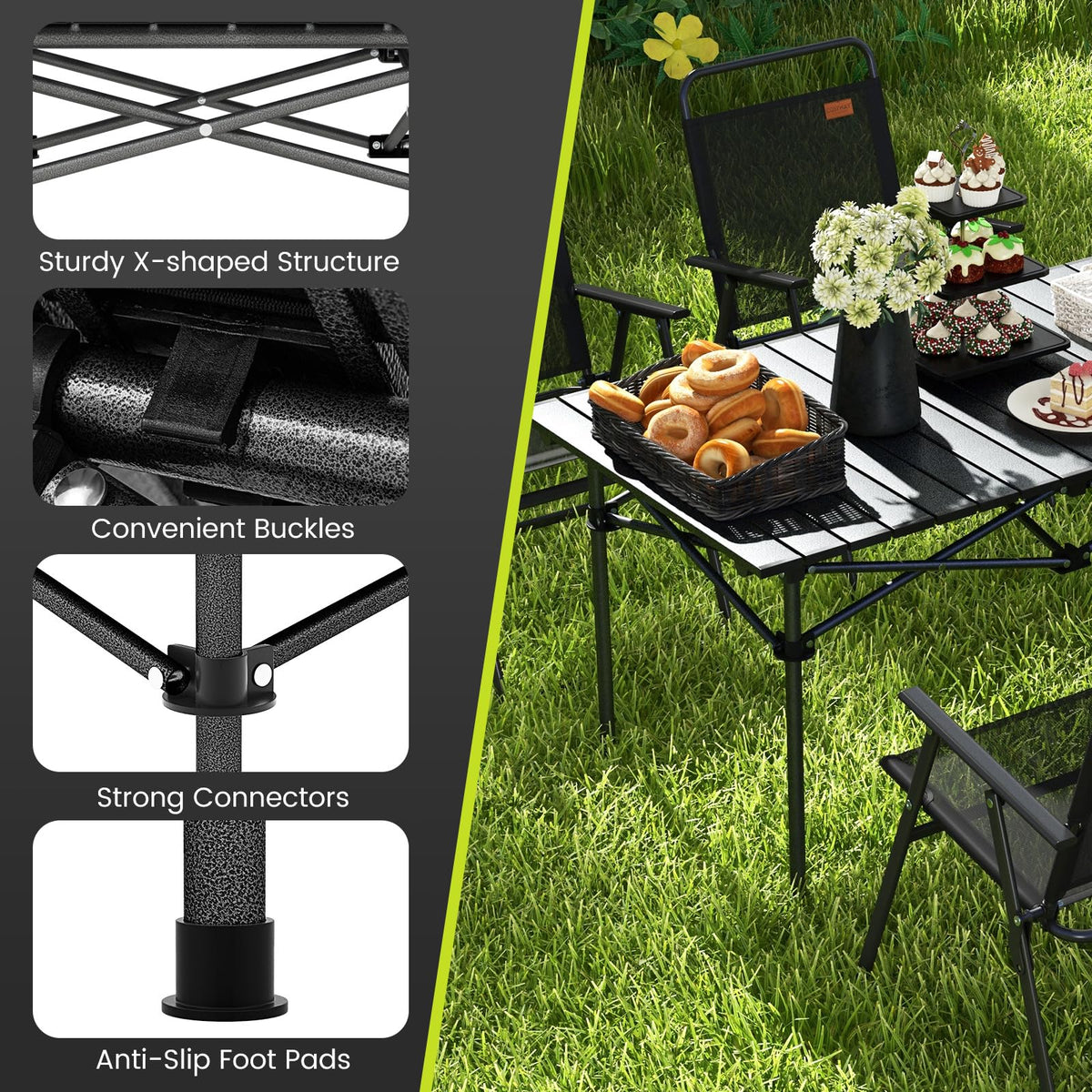 - Sturdy Metal Construction: Supported by a strong metal frame and reinforced by sturdy X-shaped structure and firm connectors, this folding picnic table offers exceptional durability and sturdiness. It can hold max weight up to 135 lbs. Plus, non-slip foot pads ensure a steady and slip-resistant base.